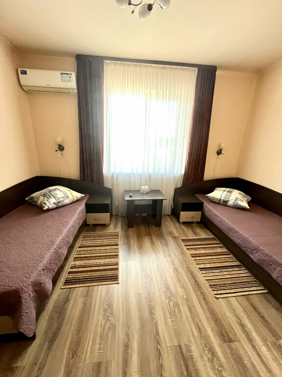 В номере: две односпальные кровати , душ , туалет , кондиционер, телевизор, холодильник , чайник, фен