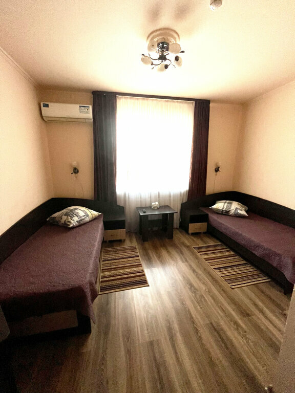 В номере: две односпальные кровати , душ и туалет на этаже, телевизор, холодильник, чайник