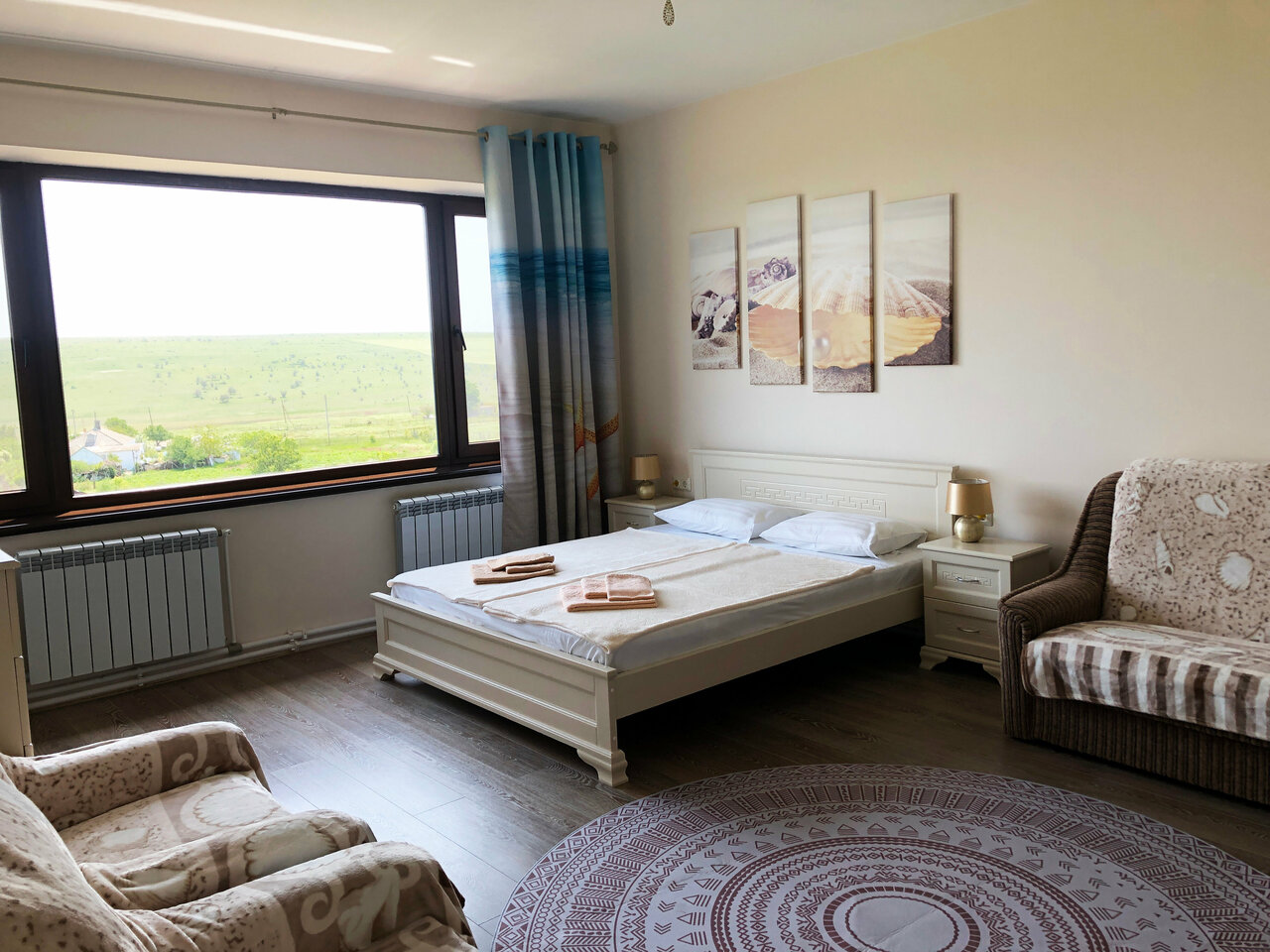Большая светлая комната на втором этаже с панорамным окном во всю стену с видом на море декорирована в светлых тонах, создающих впечатление чистоты и простора. Окна выходят на юго- восток, и каждое утро вы можете наблюдать дивную картину рассвета.