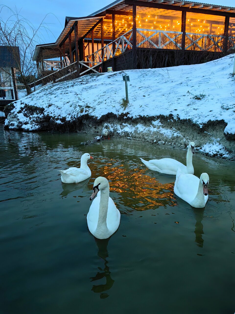 Отличная баня, коттедж на берегу озера супер, полотенца халаты все дела. Лошади классные, можно погладить покормить. Котики на территории красивые. В кафе на территории вкусно и не дорого.