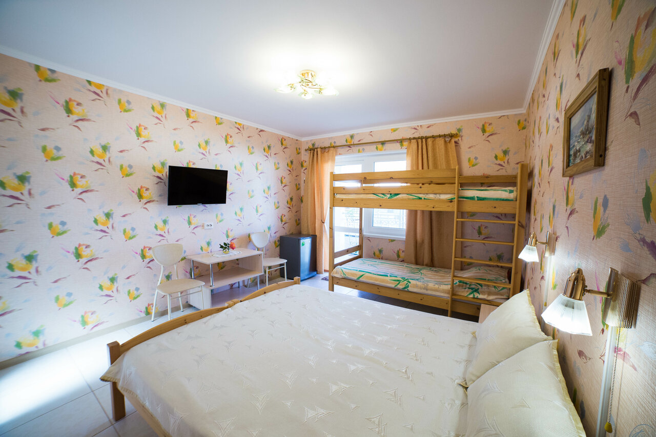 Номер с двуспальной кроватью и дополнительной двухъярусной кроватью, кондиционер, WI-FI, TV, душ, санузел.