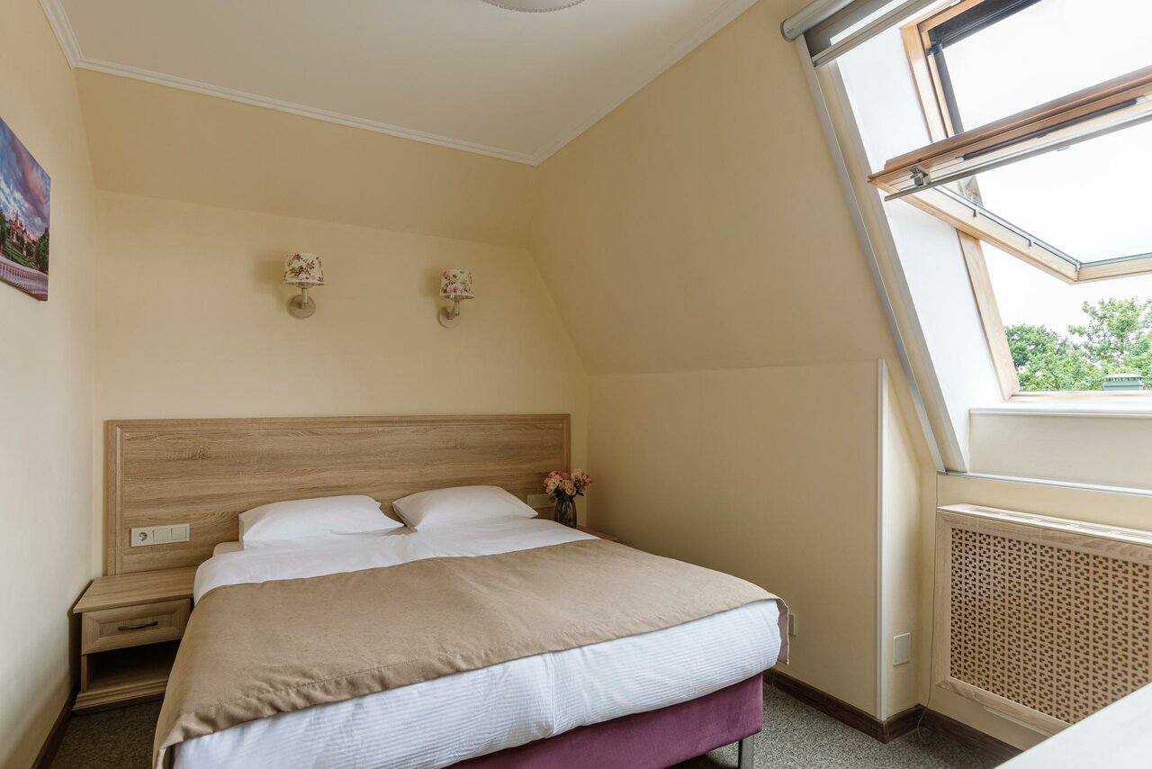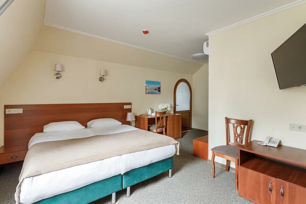 Очень приятное место. Если приезжать в Лавру, то очень удобно жить недалеко. А Блинная гора, где находится отель, — это возвышенность, откуда открывается панорамный вид на монастырь. Дорога до монастыря живописная. Я жила в номере на мансарде: современная и комфортабельная комната.