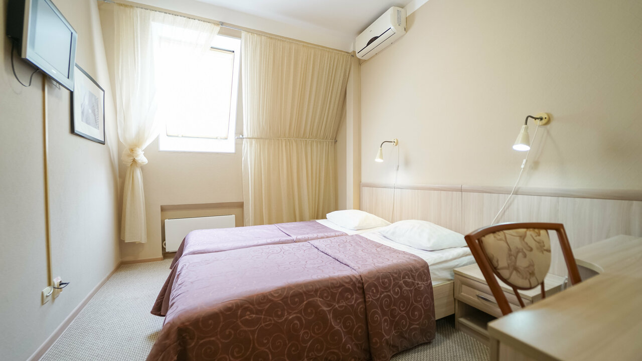 Стандартный двухместный номер оборудован двумя одноместными кроватями. В номере есть телевизор с кабельными каналами, электрический чайник (чай, сахар, кофе), мини-холодильник, кондиционер, бесплатный Wi-Fi. Также имеется собственный санузел, в ко...