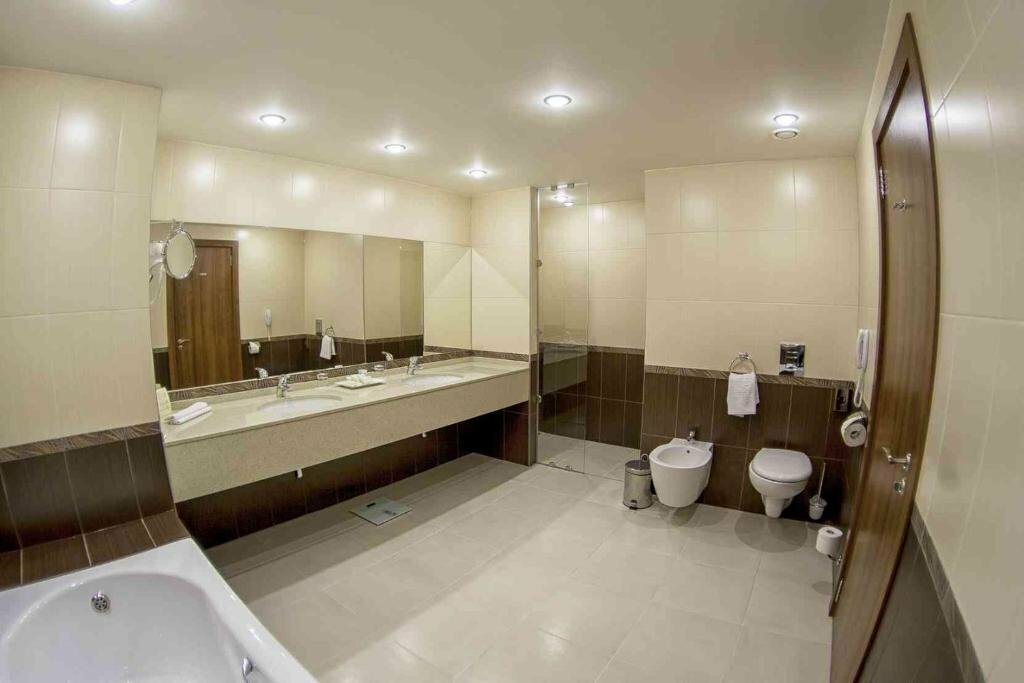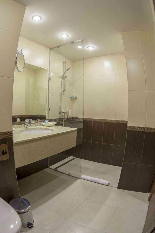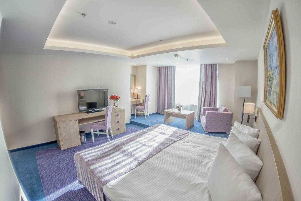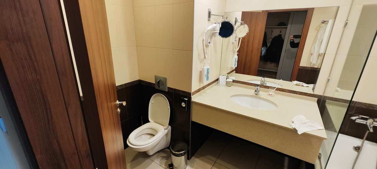 Были в отеле на выходных. Впечатления остались неоднозначные: Минусы: 1. Очень неудобный душ-ванна. Неважно в какую сторону направляешь лейку, вода льется на пол. 2. Отсутствие тапочек и туалетных принадлежностей разочаровало. 3. Очень громкая музыка в ресторане. Мы жили на 12 этаже и все равно всю ночь слышали биты. Спалось просто ужасно 4. В номере не очень чисто. 5. Очень неприветливый персонал Плюсы: 1. Очень большой номер и огромная кровать 2. Хорошее расположение. Рядом тц с кино и ресторанами Впечатления остались неоднозначные