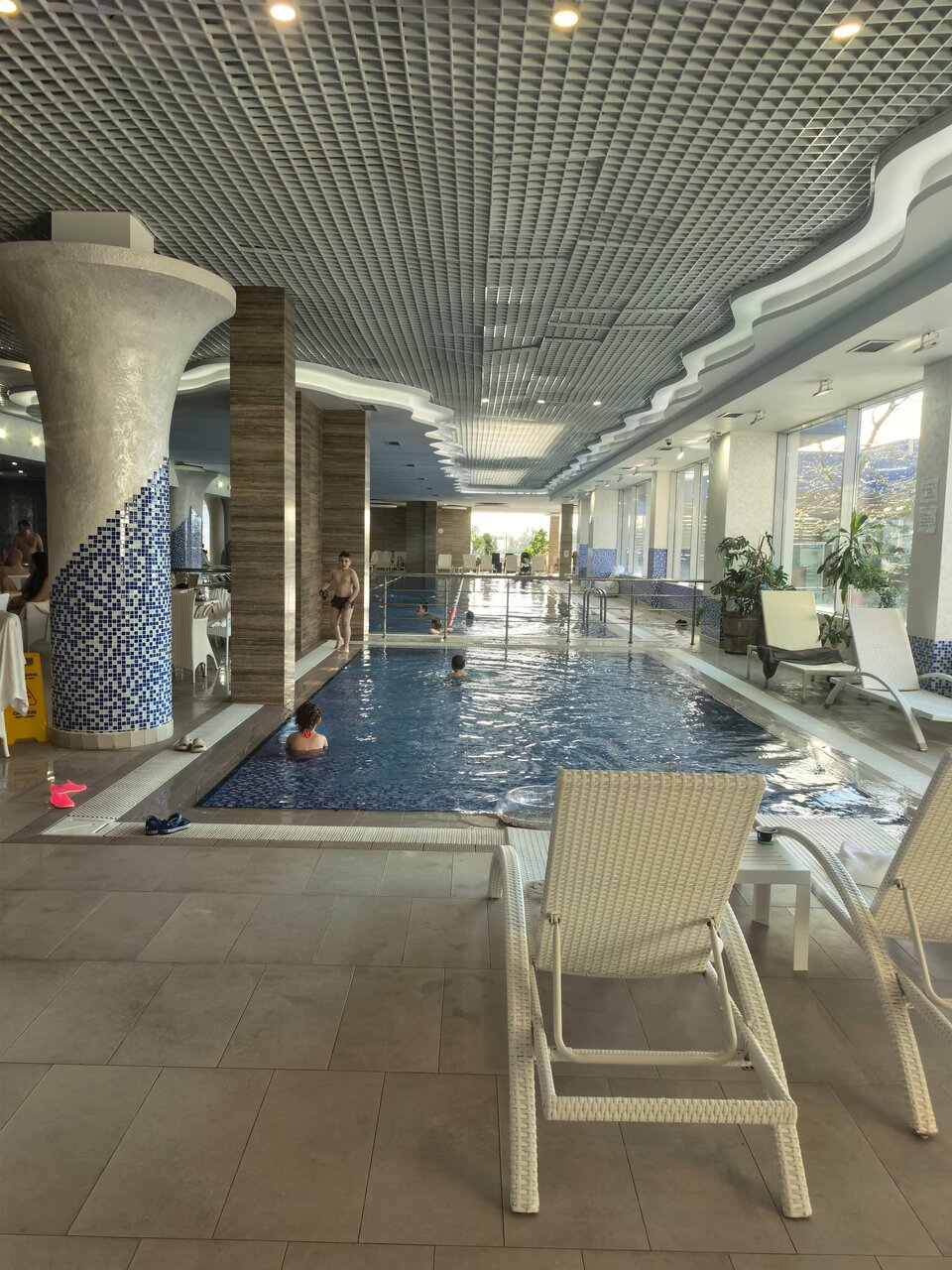 Место отличное. Бассейн с подогревом, вода приятной температуры поблизости очень много заведений таких как хинкальная Старик Хинкалыч, Ракушка и Брискет. Чтобы добратья до них иди надо вдоль пляжа до дороги.