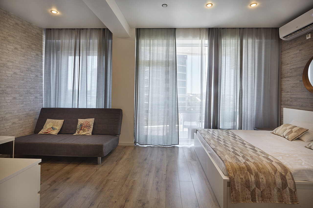 Прекрасный апартамент, с видом на море. Сдержанный дизайн, не лишенный современных деталей для вашего удобства. У нас имеется два подобных номера, в одном доступно (9 этаж) до 3 гостей, до 4 гостей (10 этаж).
