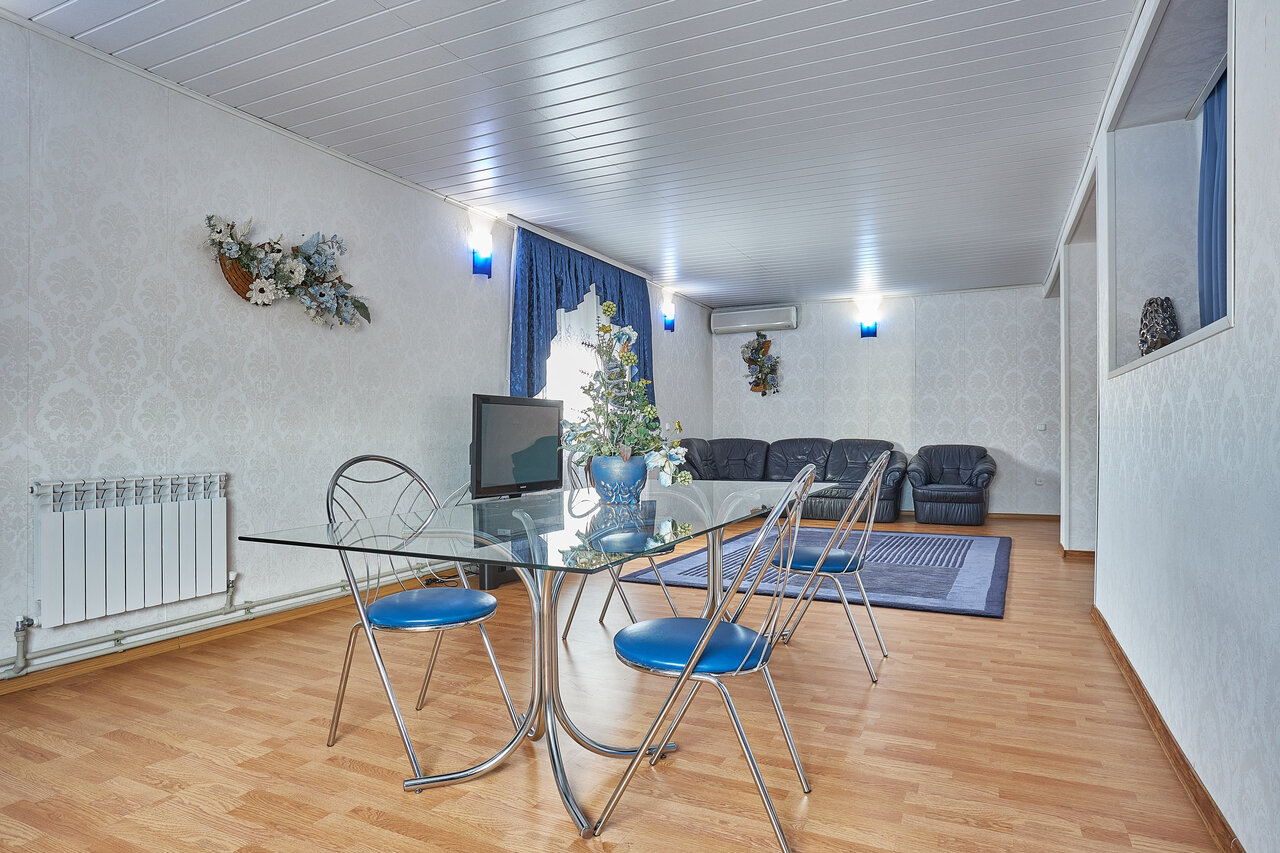 Просторный двухкомнатный номер с гостиной и спальней для двух гостей, дополнительно одно спальное место для ребенка. В номере кондиционер,телевизор, холодильник, стол, WI-FI и всё, что нужно для комфортного отдыха. 2 осн. места +1 доп.