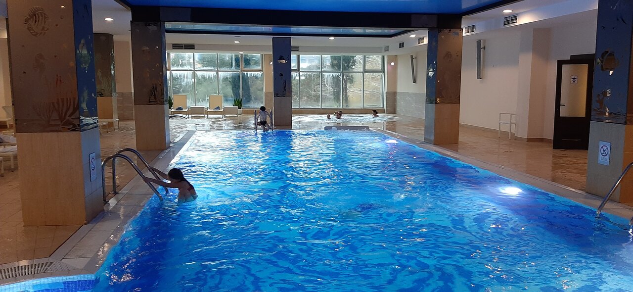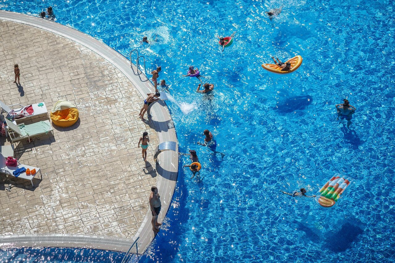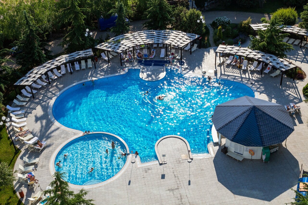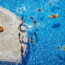 Большой открытый плавательный бассейн с солёной водой и подогревом, водными аттракционами и детской зоной: общая площадь - 900 кв.м, глубина от 0,4 м (в детской зоне) до 1,8 м (во взрослой зоне).