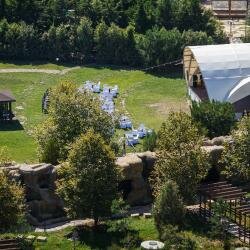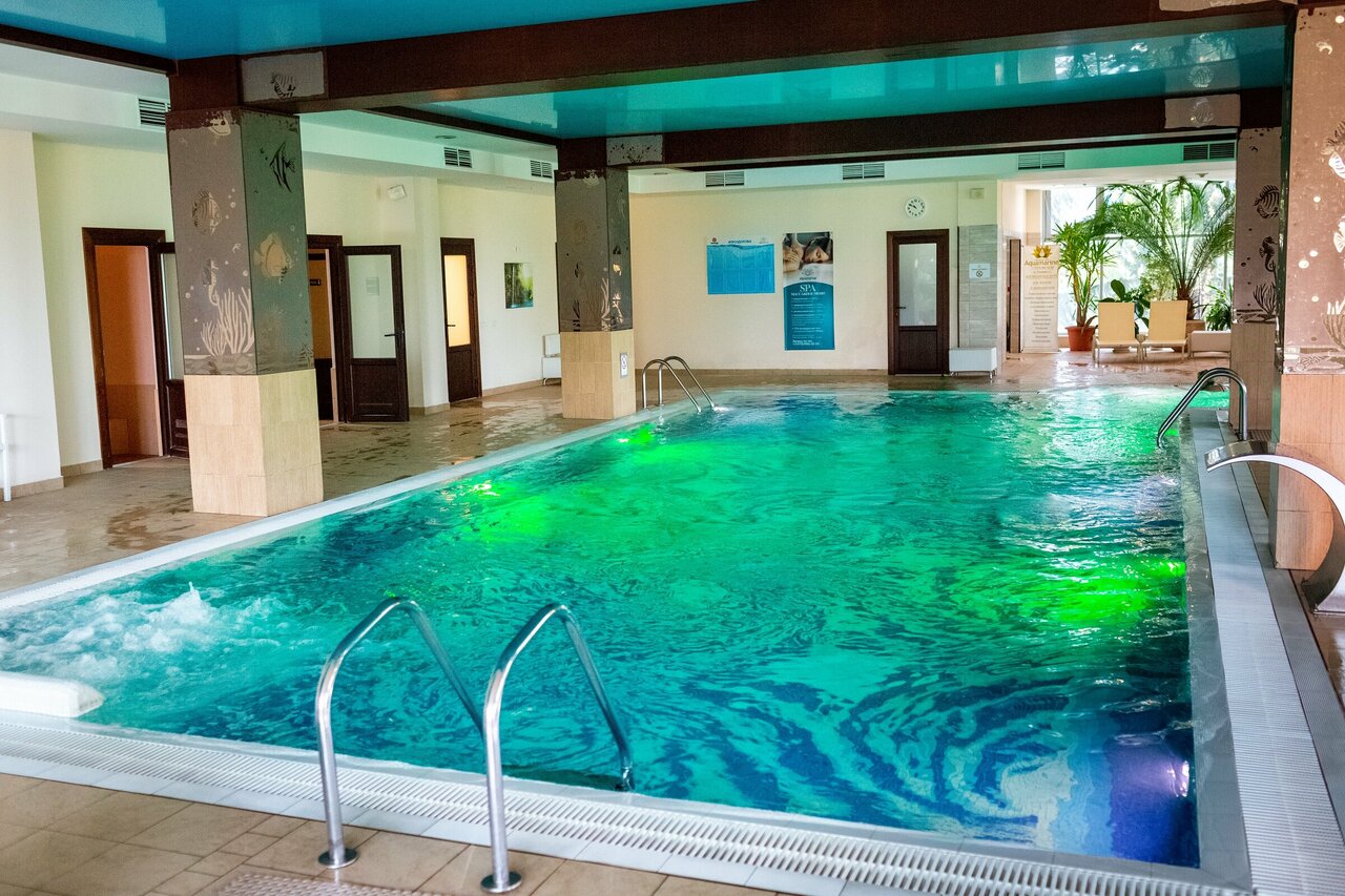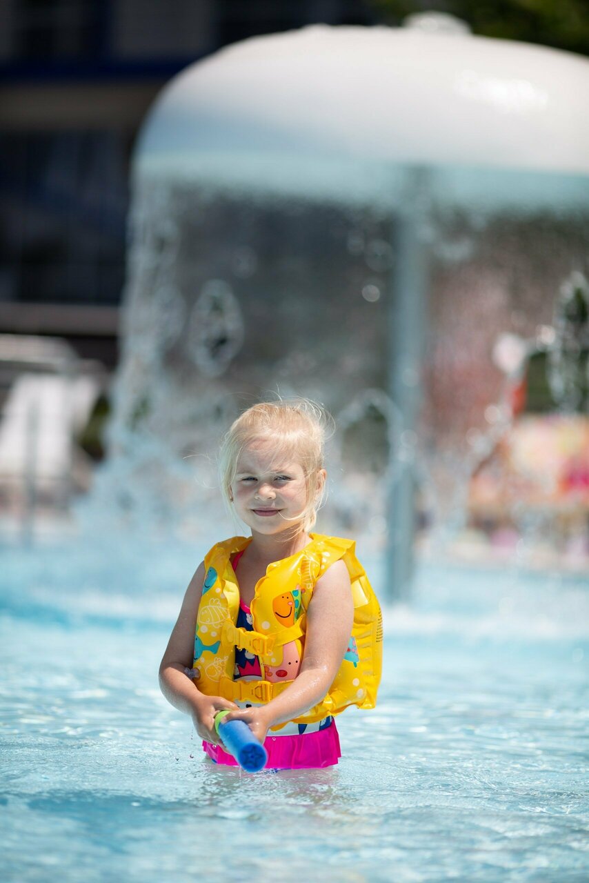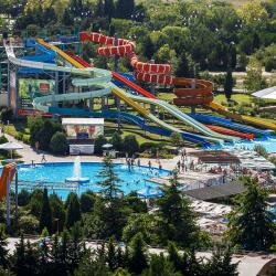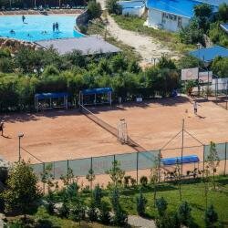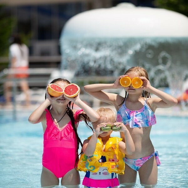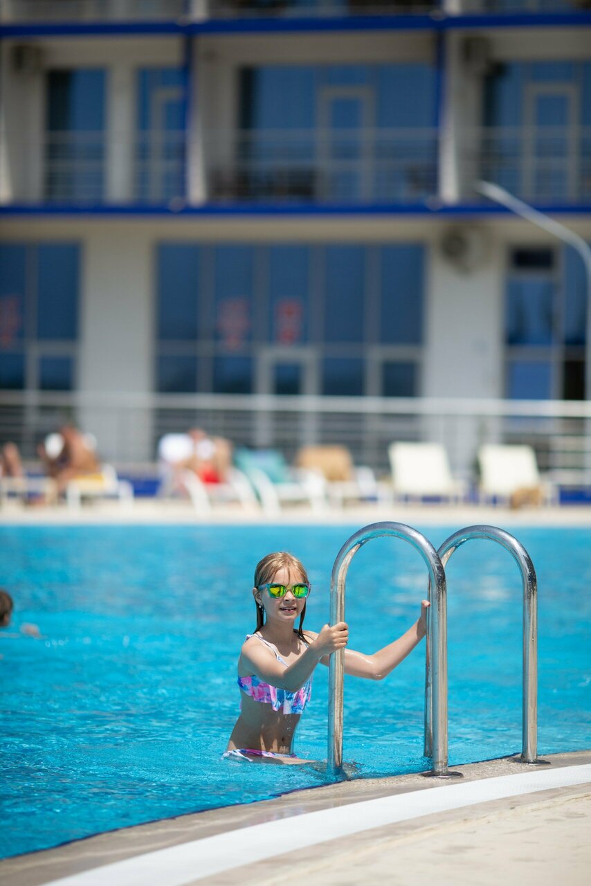 Большой открытый плавательный бассейн с солёной водой и подогревом, водными аттракционами и детской зоной: общая площадь - 900 кв.м, глубина от 0,4 м (в детской зоне) до 1,8 м (во взрослой зоне).