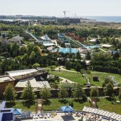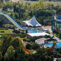 18 горок и 9 чистейших бассейнов с пресной водой (5 бассейнов для взрослых; 1 подростковый; 2 для малышей и волновой бассейн), фонтан высотой 15 метров, гидромассаж, водопады, души различных модификаций, открытый бассейн диаметром 30 м.