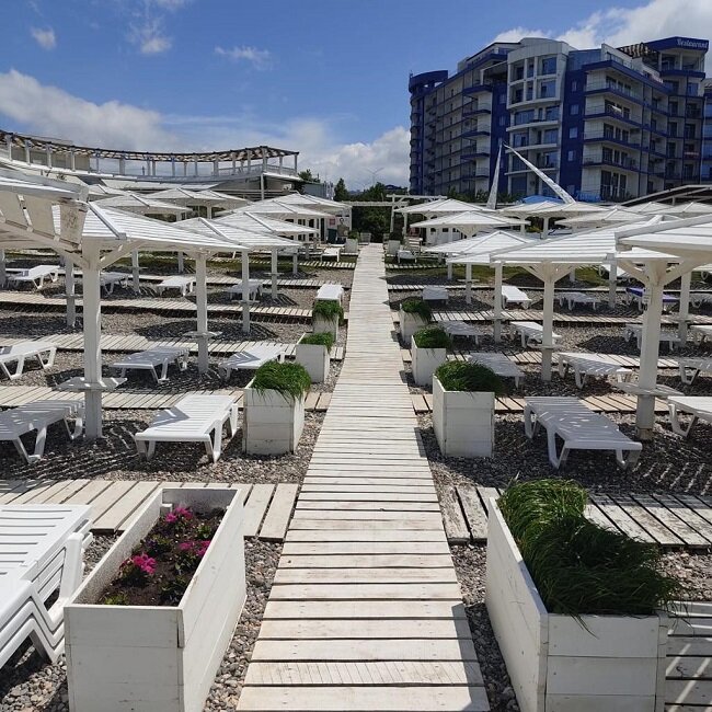 Хороший комплекс, есть свой пляж, с шезлонги для жильцов бесплатно. Есть на территории бассейн, так же для жильцов бесплатно.