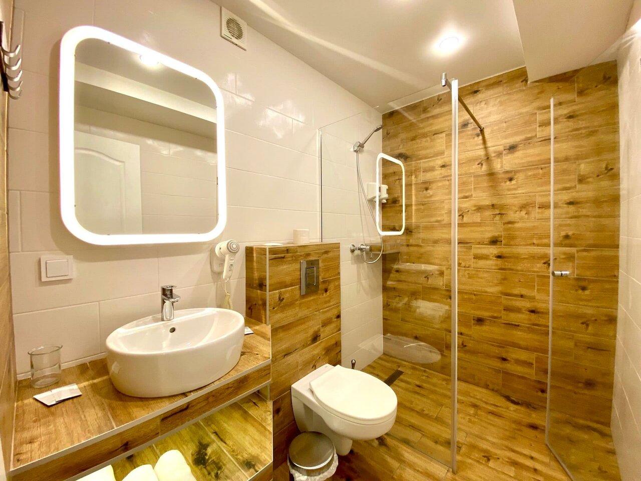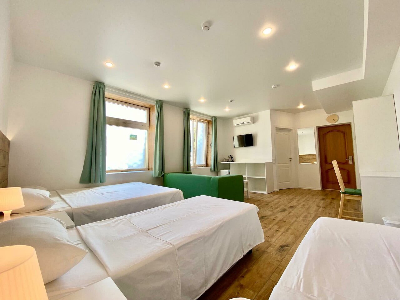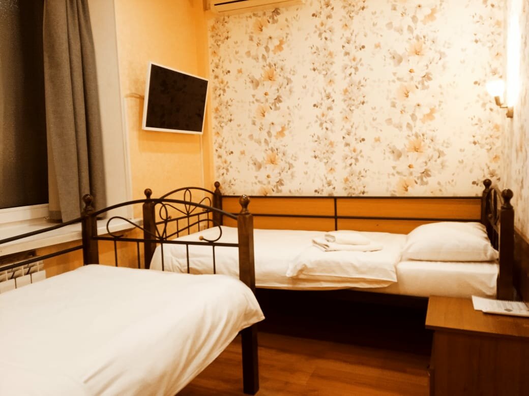 Снимали номер на четверых, он был на первом этаже сразу за входной дверью в гостиницу. Жуткий санузел, духота, кондей только в гостинной, в спальне нет вентиляции и окна заклеены пленкой, слышно когда за окном проходят люди, так словно возле тебя, а это шествие происходит всю ночь.