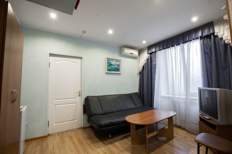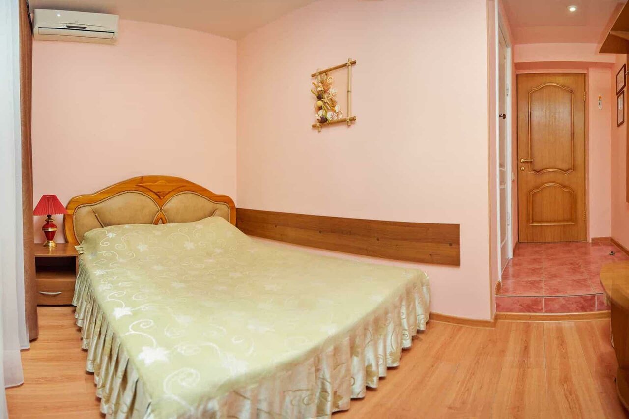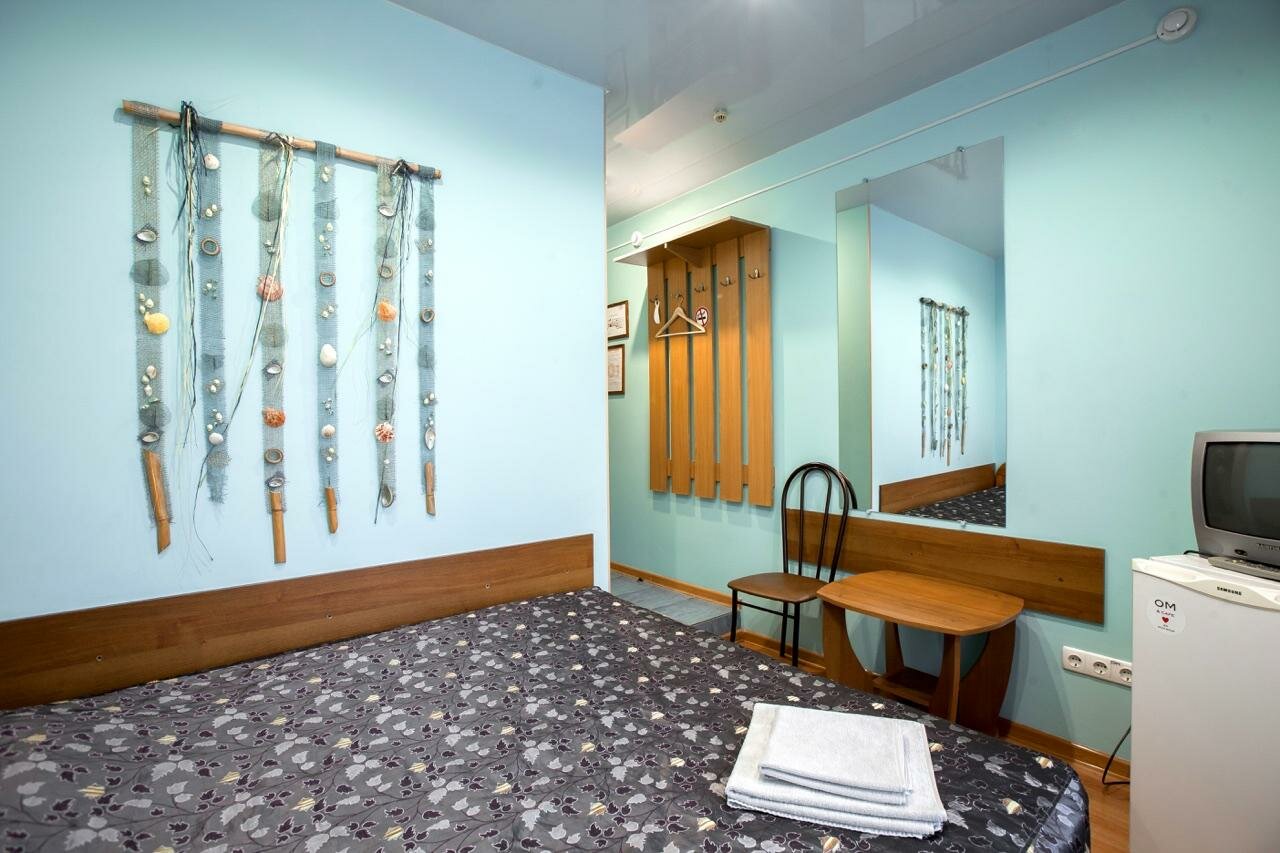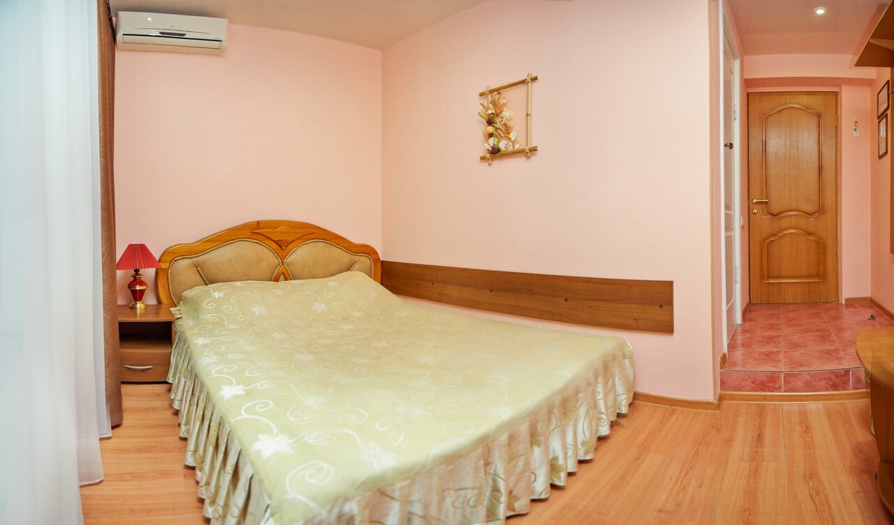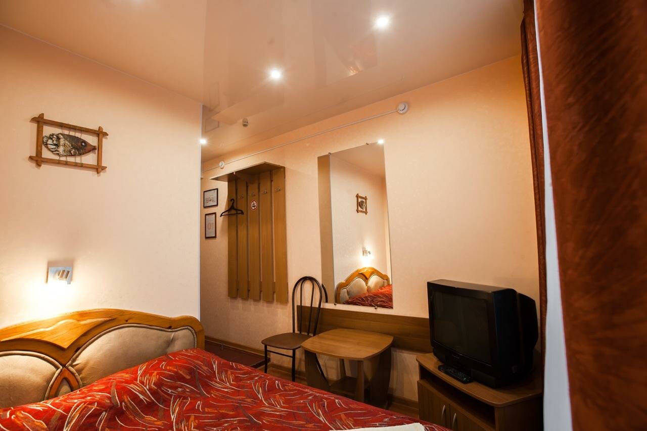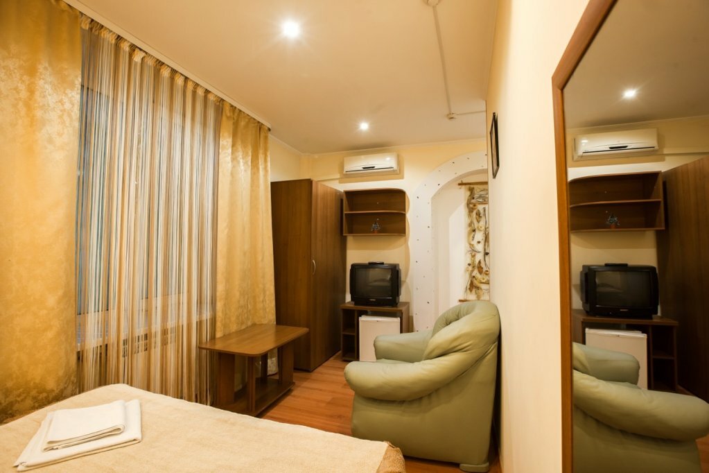 Бронировали стандартный двухместный номер, вполне приличный мини-отель, интерьер простенький, но всё чисто и убрано. Номер небольшой, вида из окна нет — 1 этаж и окно занавешено, есть всё необходимое для отдыха- свежее постельное белье, полотенца, тапочки, шампуни, мыло, гели, чайный набор с чайничком, кондиционер, ТВ. Из минусов считаю, что 2500р за сутки дорого для данного мини-отеля без завтраков, расположен в частном секторе, инфраструктуры нет, до ближайшего кафе от мини-отеля идти пешком около 2 км по темным дворам, парковки так же нет, улочки узкие — двум машинам сложно разьехаться.