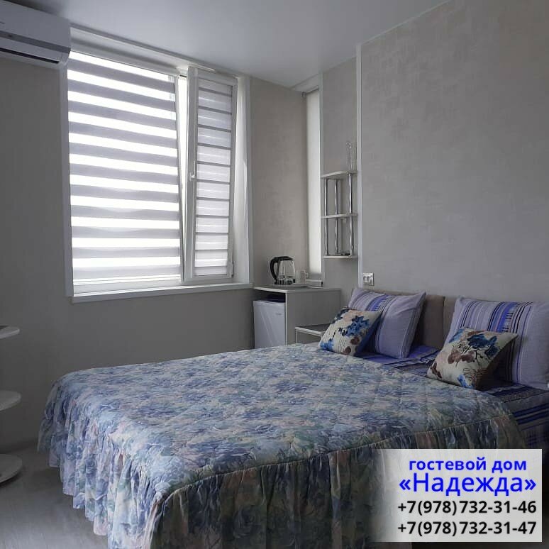 Гостевой дом «Надежда» (Севастополь, ул. Кряжева, 34) предлагает комфортное проживание в номерах с кондиционером, Wi-Fi, телевизором и холодильником. К услугам гостей: общая кухня с техникой, бесплатная парковка, собственный песчаный пляж, терраса, сад и площадка для пикника. Разрешено проживание с животными. До центра города — менее 5 км, рядом парк и море.
