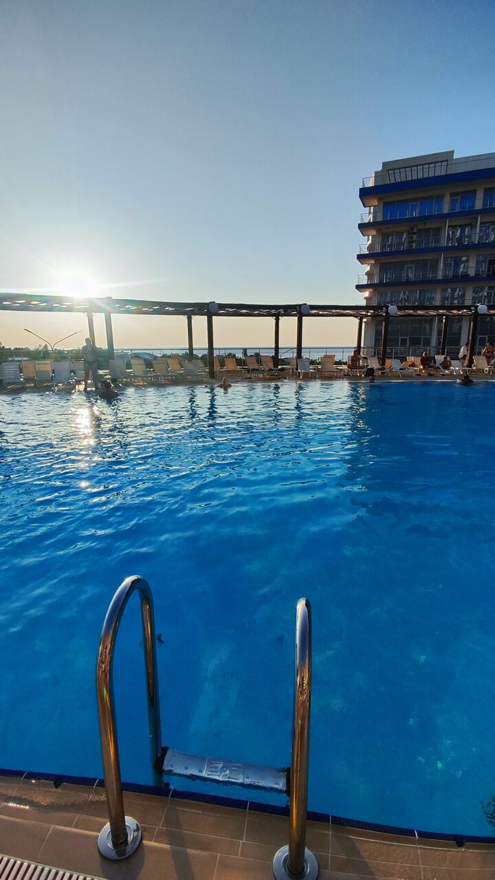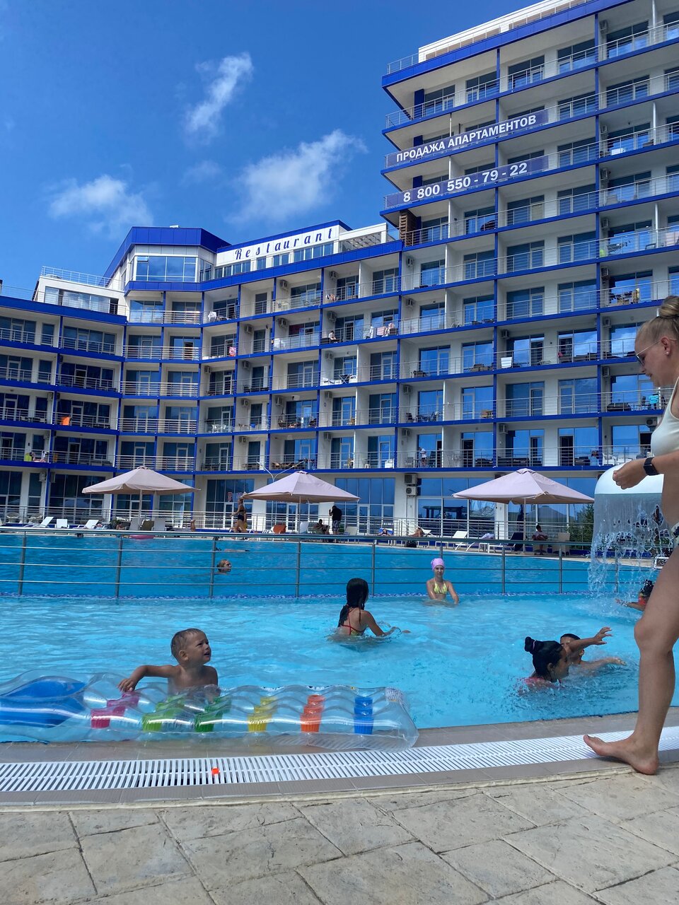 Отличный апарт отель, бассейн просто большой, тёплый и солёный кофейни и магазинчик на 1 этаже, набережная сразу за калиткой и пляж, отдыхаем там каждый год