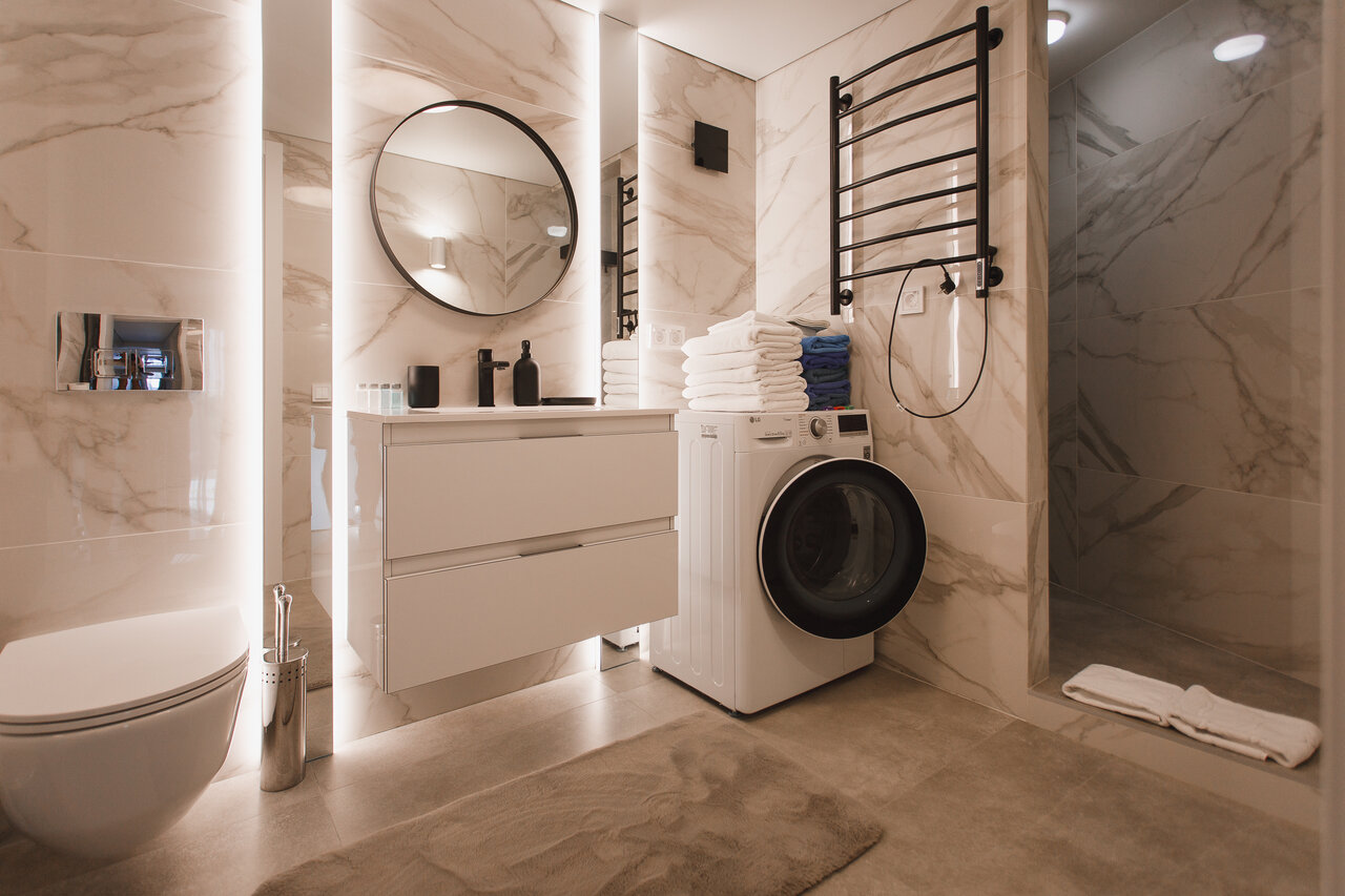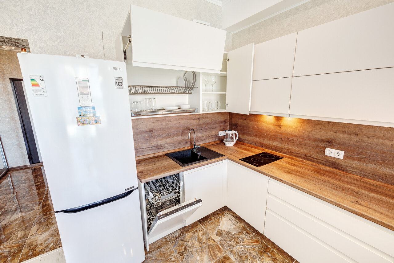 - Полный набор бытовой техники (стиральная машина, микроволновка, индукционная плита).