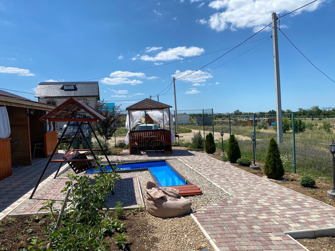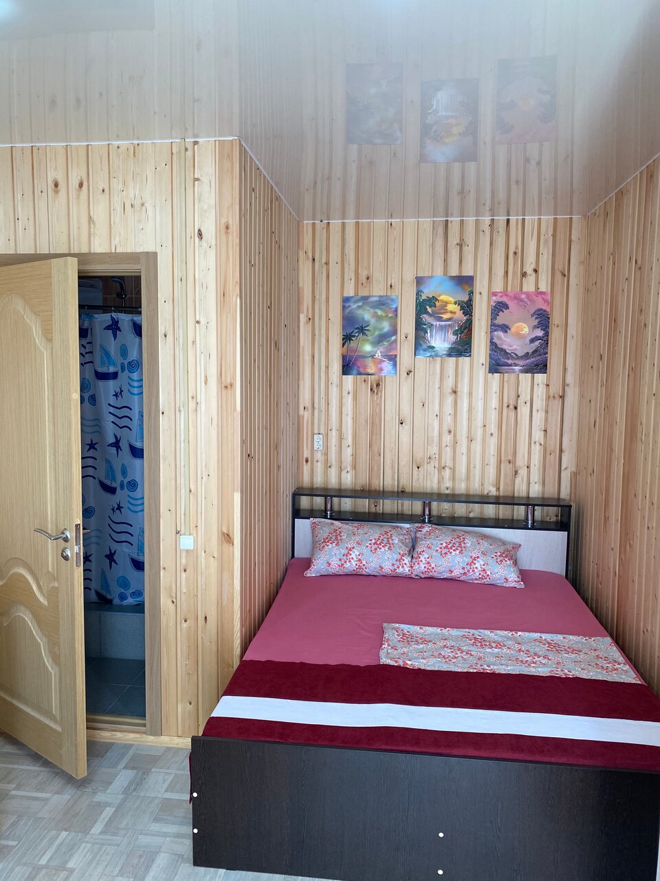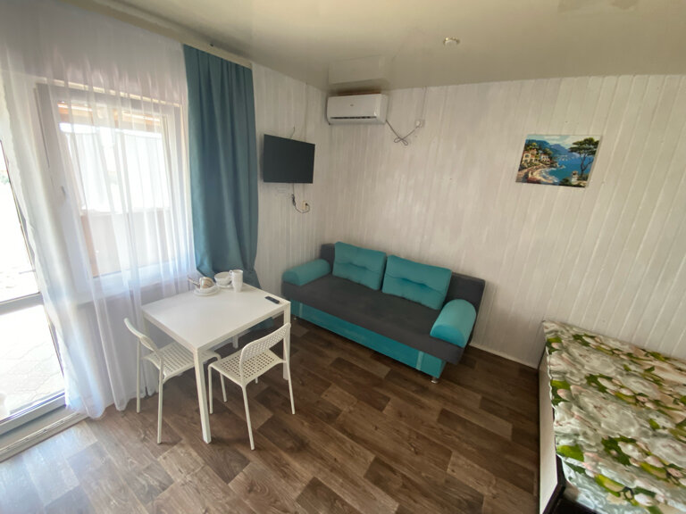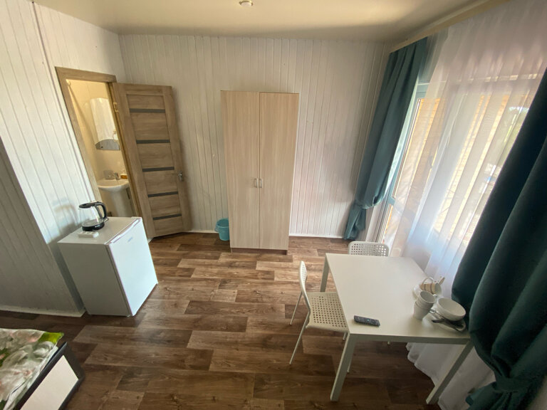 Есть всё для комфортного проживания. Кондиционер, холодильник, телевизор, шкаф для одежды, душевая и санузел совмещены, есть раковина, чайник, посуда. Отделка вагонкой, что создаёт уют. Бойлер для нагрева воды в душе. Во дворе есть биседки для отдыха, монгальная зона, есть мини бассейны, территория огорожена забором. До моря примерно 10 минут пешком. Из минусов пока по плизости нет магазина, но можно проехать две остановки на маршрутке или на машине 5 минут. Вечером можно увидеть шикарный закат, с территории гостиничного двора видно море!