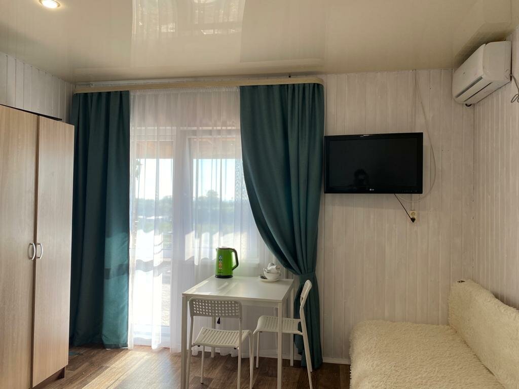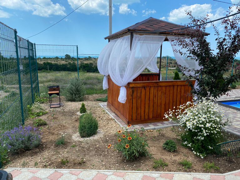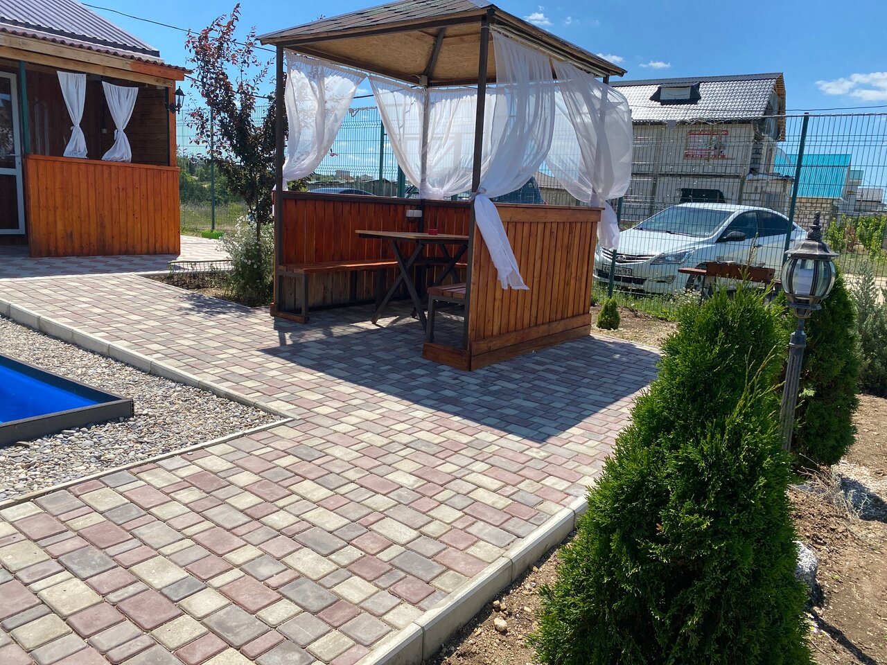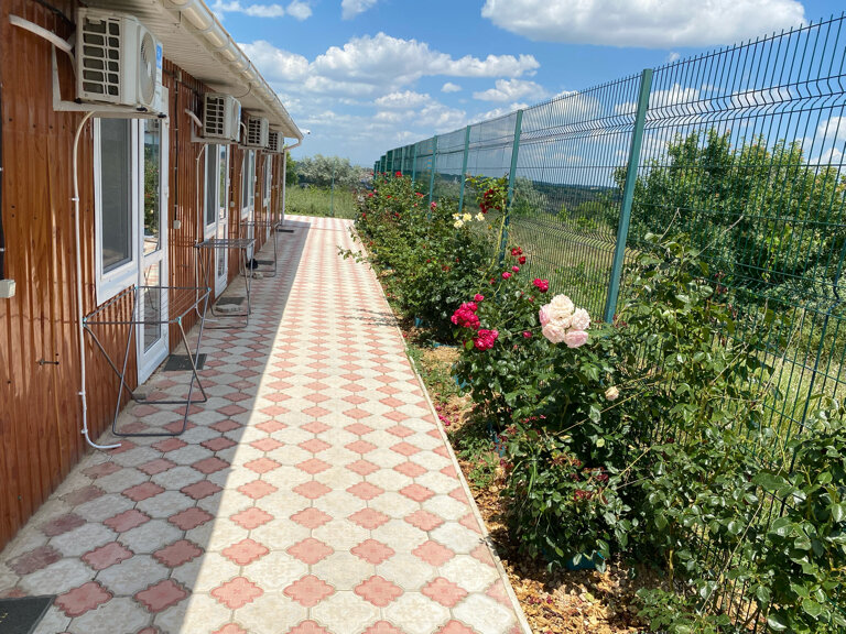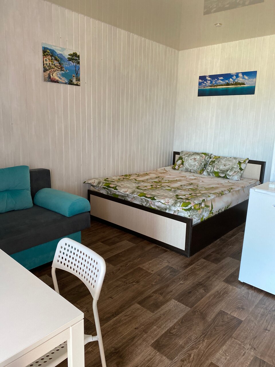 Есть всё для комфортного проживания. Кондиционер, холодильник, телевизор, шкаф для одежды, душевая и санузел совмещены, есть раковина, чайник, посуда. Отделка вагонкой, что создаёт уют. Бойлер для нагрева воды в душе. Во дворе есть биседки для отдыха, монгальная зона, есть мини бассейны, территория огорожена забором. До моря примерно 10 минут пешком. Из минусов пока по плизости нет магазина, но можно проехать две остановки на маршрутке или на машине 5 минут. Вечером можно увидеть шикарный закат, с территории гостиничного двора видно море!