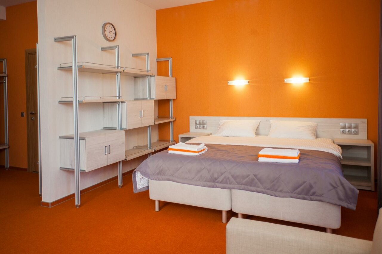 Двухкомнатный с двухспальной кроватью, двухярусной кровью и диваном. Номер с балконом