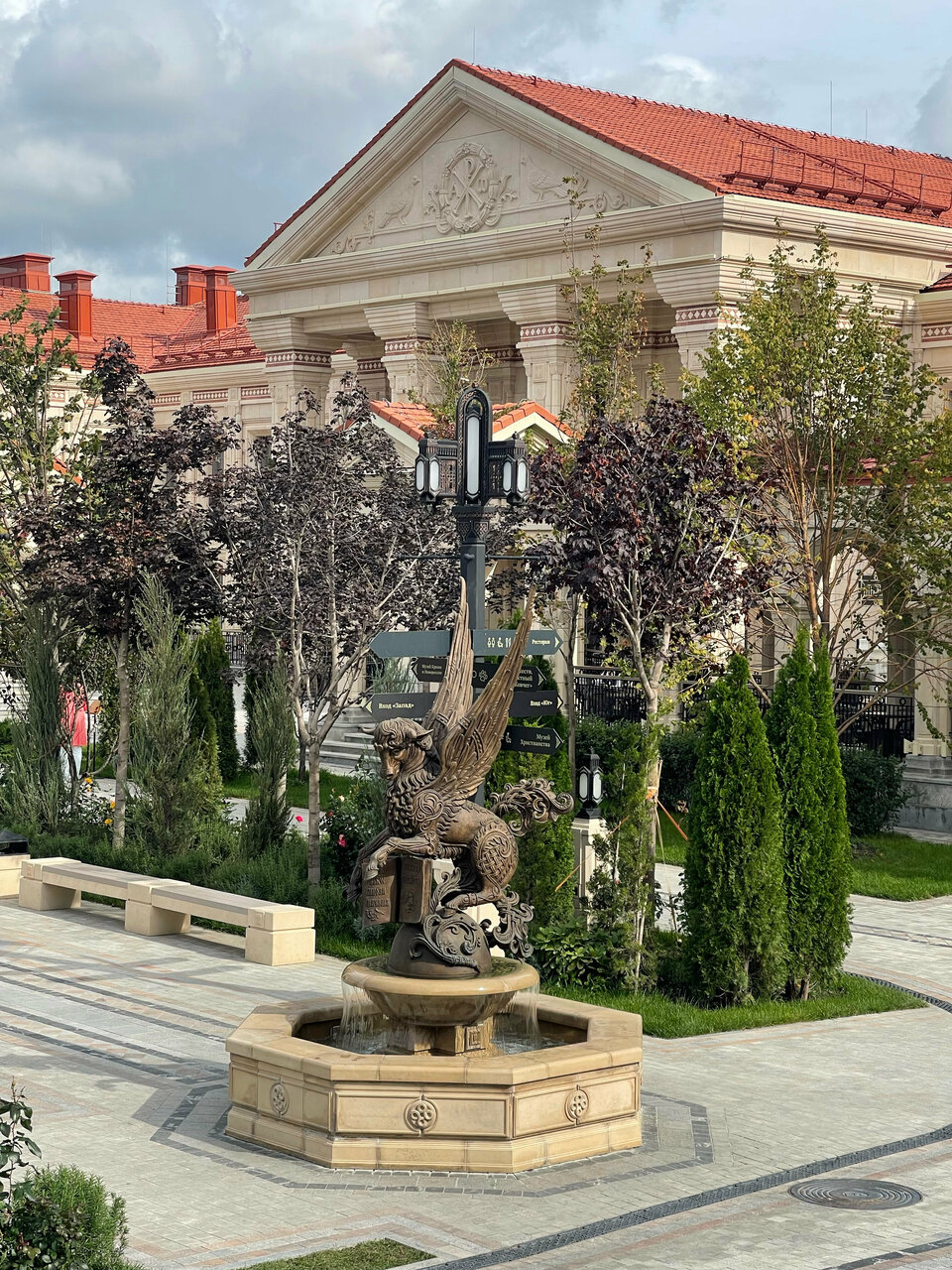 - Живописные пейзажи, фонтаны, пруд с рыбками.