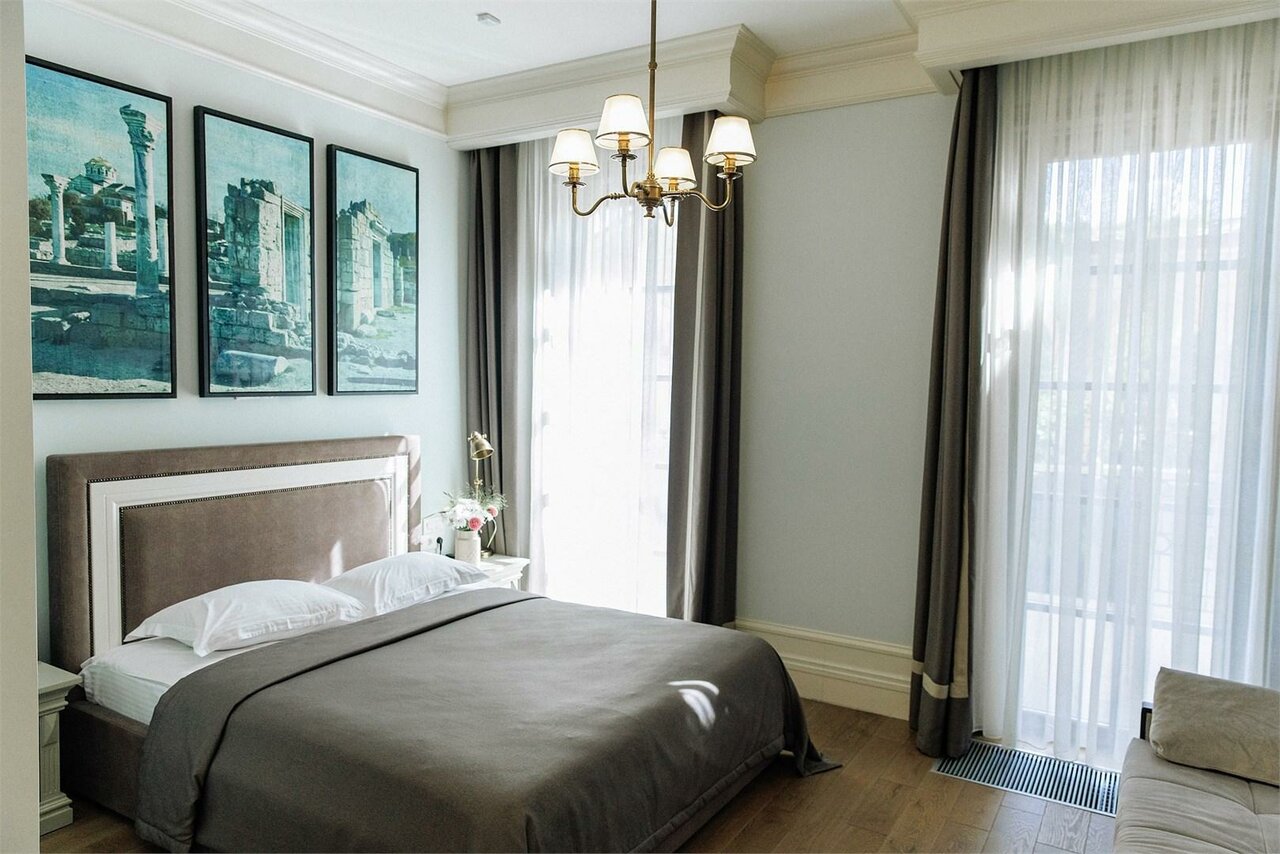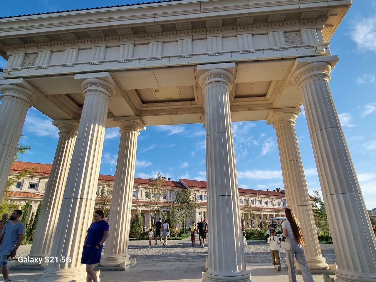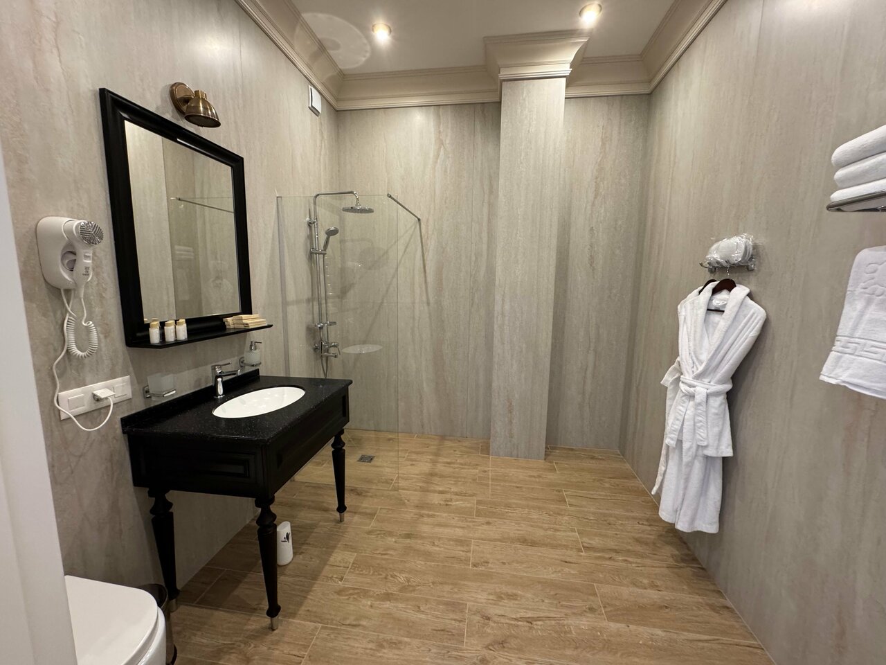 Отель и территория просто супер! Оформлено в классическом, историческом стиле, всё новое — комфортно, красиво, на высшем уровне! Хотела отметить особое приятное внимательное отношение к детям, в номере для удобства был детский набор — щетка, паста, гель и шампунь, подставка для ног к раковине и сидение для туалета. Особенно умилил детский халатик, не видела такого в других отелях. В ресторане Омега был подарочек после обеда для ребенка — очень приятно! Вообще кухня в Омеге очень понравилась — вкусно, быстро и внимательно обслуживают. Были даже свежие устрицы!Спасибо! Территория просто сказка — гулять и гулять! Мы в восторге! И сами здания в византийском стиле и ландшафтные решения, фонтаны, канал с карпами и скульптурами писателей, детские игровые площадки и огромное количество прекрасных посадок! И в конце выход в старый Херсонес, который тоже замечательно облагородили, но и сохранили то что было раньше. Вернемся обязательно еще не один раз!