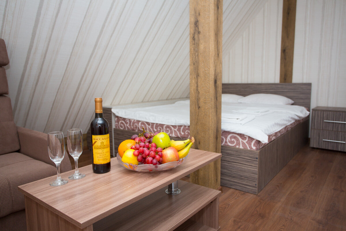 В номере: одна двухспальная или две односпальные кровати, дополнительное место, шкаф, комод, журнальный столик, холодильник, телевизор, кондиционер, сейф, санузел, wi-fi.Стоимость - с октября по апрель 2 300 руб./сутки, с мая по сентябрь 3300р.