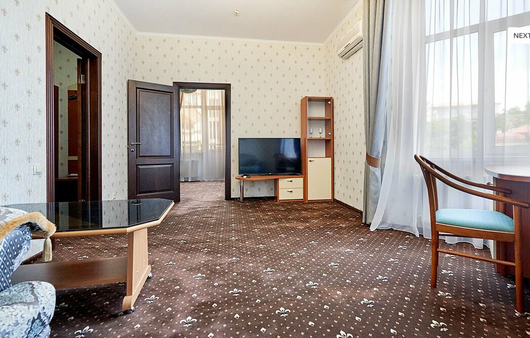 Просторный номер категории Люкс Плюс был обновлен в 2020 году и отлично подойдет для двоих гостей. Номер комплектуется двуспальной кроватью. В гостиной комнате есть диван. В ванной комнате все удобства, ванна или душевая кабина. Есть прихожая комната