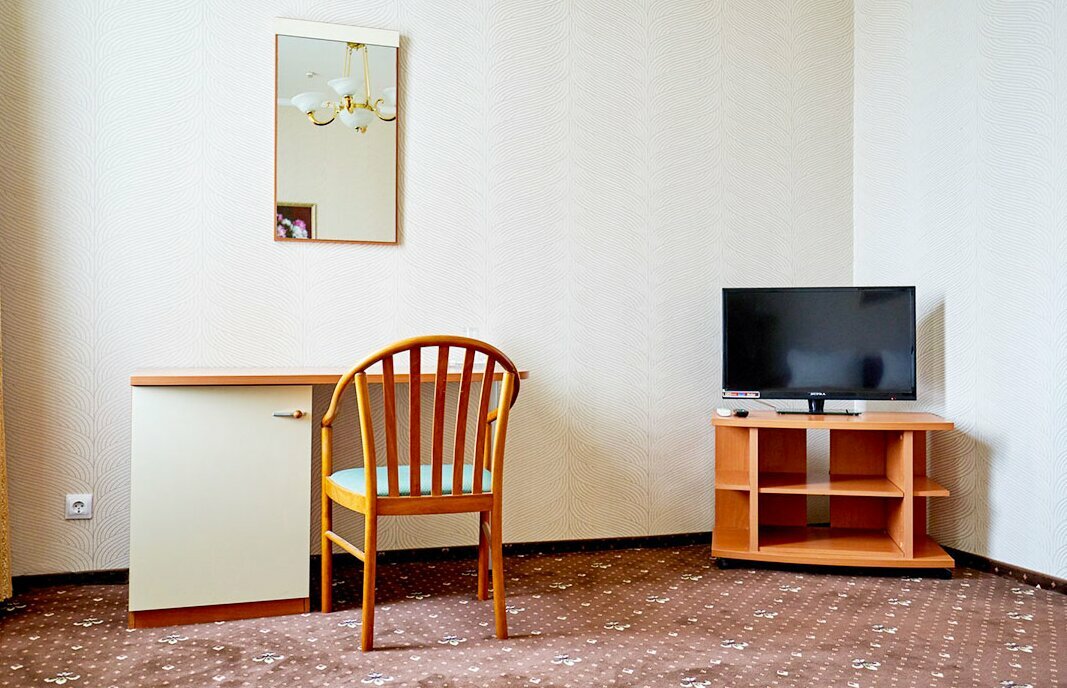 Просторный номер категории Стандарт отлично подойдет для двоих гостей. В номерах двуспальные кровати. В ванной комнате все удобства, ванна или душевая кабина. Есть прихожая комната с мебелью. В номере есть вся необходимая для комфортного отдыха техни