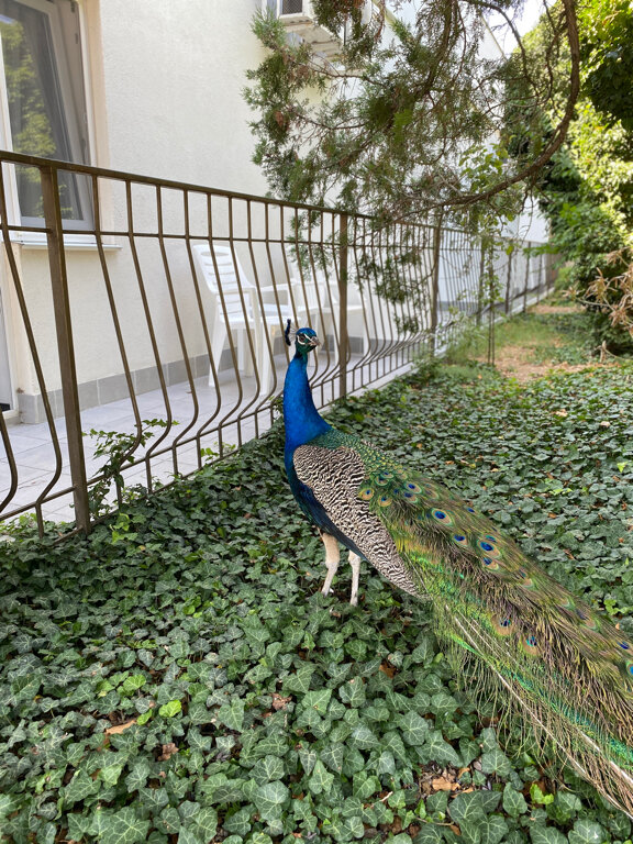 - Благоустроенная территория с павлинами.