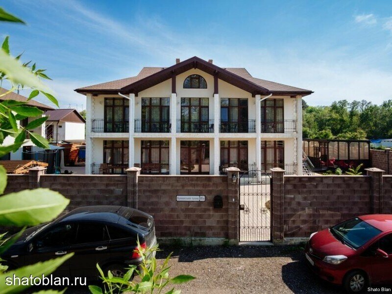 Рядом — парк и песочно-галечный пляж. Заселение с 14:00, выезд до 12:00. Контакты: +7 (978) 837-28-27, shatoblan.com.