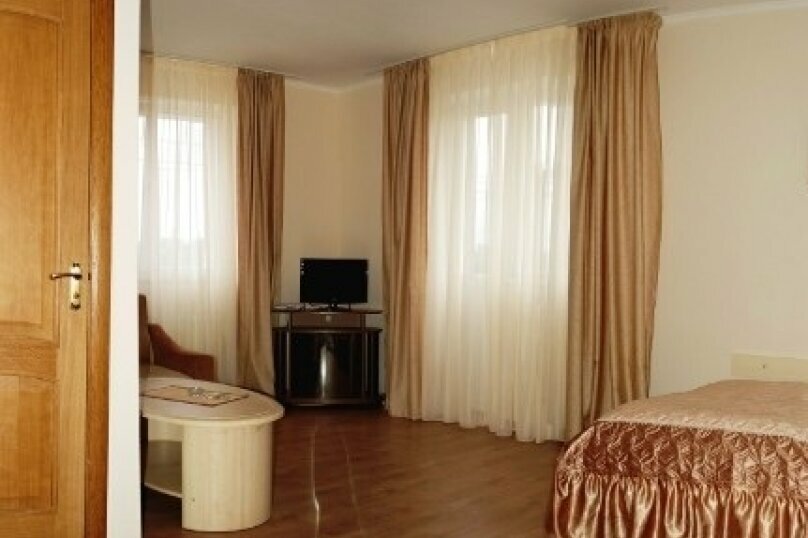 Площадь 21 кв. м.Двуспальная кровать шириной 140 смКухня, холодильник, чайник, СВЧ-печь, плита, мультиварка, утюг, гладильная доска, сейф