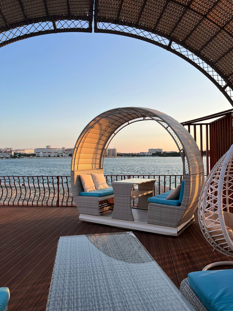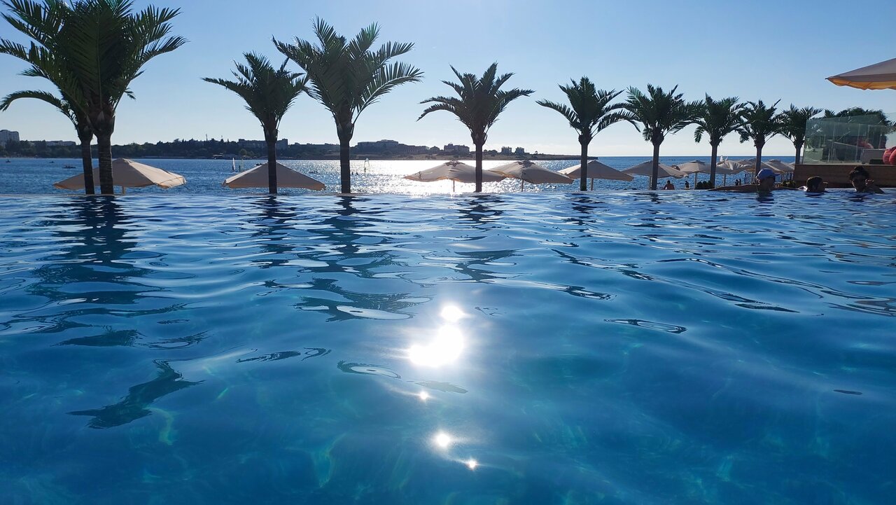 С приветики удовольствием проводу там выходные! Чистая вода, приятный персонал. Можно заказать туда суши. В местном кафе, находящемся недалеко от бассейна, никогда ничего из еды нет. Все решабельно и удобно. На выходных много детей и бестолковыми родителями, которые не научили своих отпрысков манере поведения. Первый ряд вечно страдает от невоспитанных детей и таких же папаш. Крики, брызги обеспечены . А в целом мне очень нравится. Красивый закат.