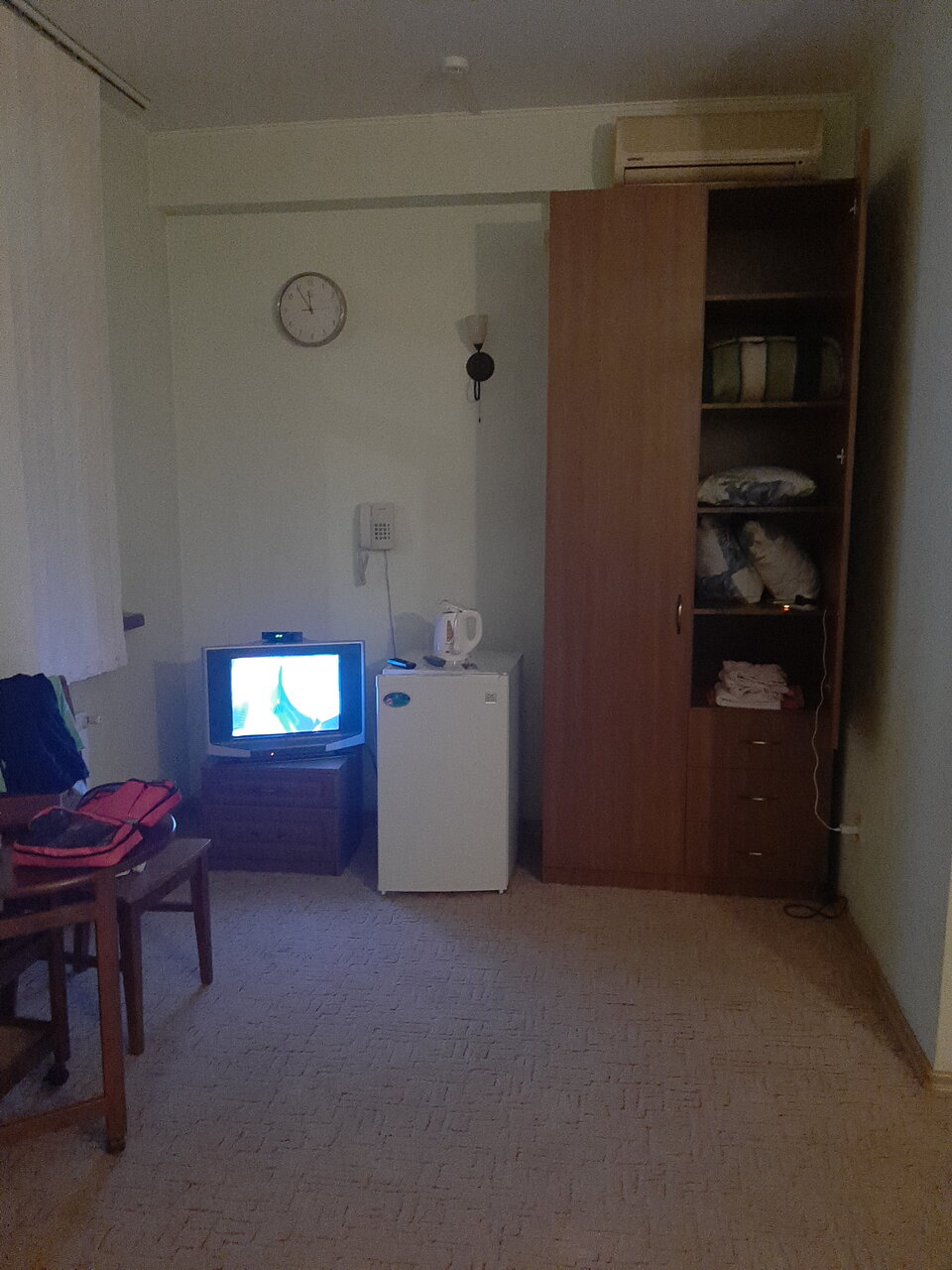 Гостиница по виду не три звезды, а две. Ремонт не делали лет 10. При бронировании цена была озвучена одна, а по факту приезда цена увеличилась. Так как мы были с ребёнком деваться нам было не куда и они это знали. По расположению очень не удобно. До центра далеко, до моря ещё дальше В один день забыли нас предупредить об отключении воды. Не советую эту гостиницу. Хорошо, что мы там были всего три ночи. Из плюсов : соседей не было слышно. Просто поспать без комфорта — можно