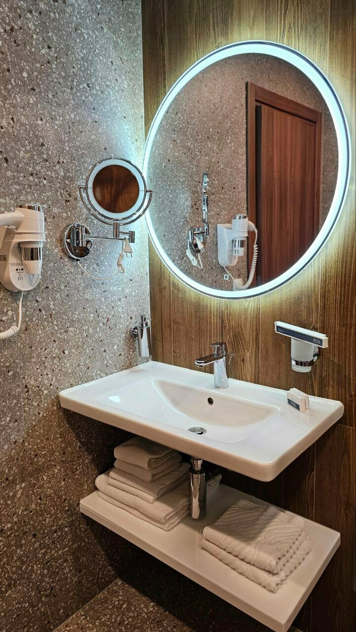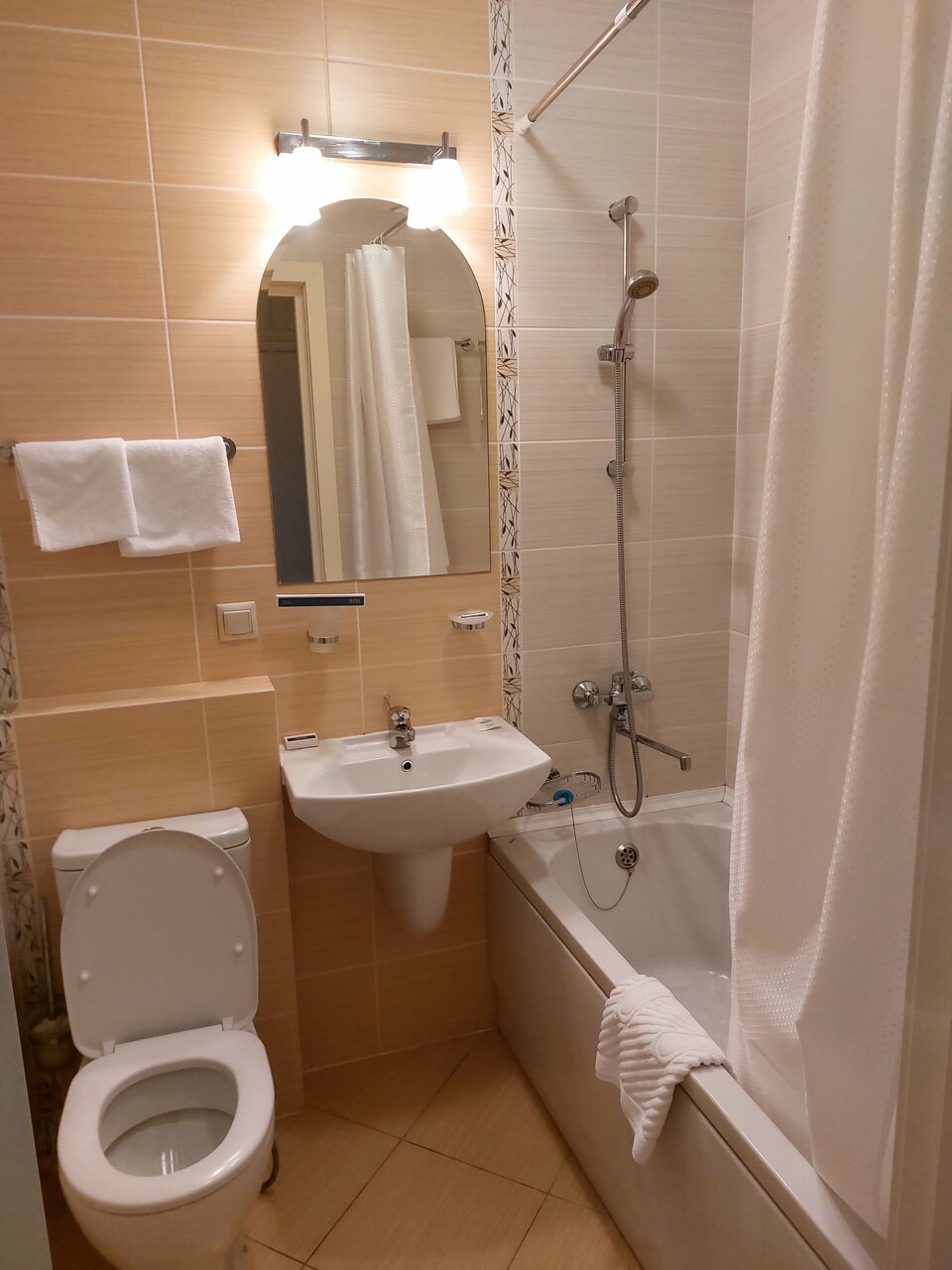 Самая лучшая гостиница. Номера большие, чистые. Кровати удобные. В ресторане кормили очень вкусно. Культурный и вежливый персонал. В номерах есть фен, чайник. Лифт поднимается быстро.