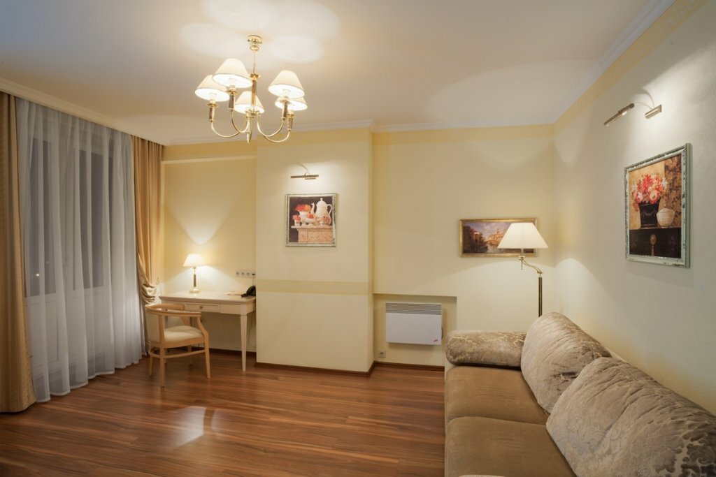 Удобства: — Бесплатные Wi-Fi и парковка — Ресторан, бар, кафе, банкетный зал — Завтрак по меню, доставка еды в номер — Трансфер (платный), прачечная, сейф — Конференц-зал, переговорная — Сауна, салон красоты, массаж — Детские кроватки (платно), меню для детей — Лифт, круглосуточная стойка регистрации