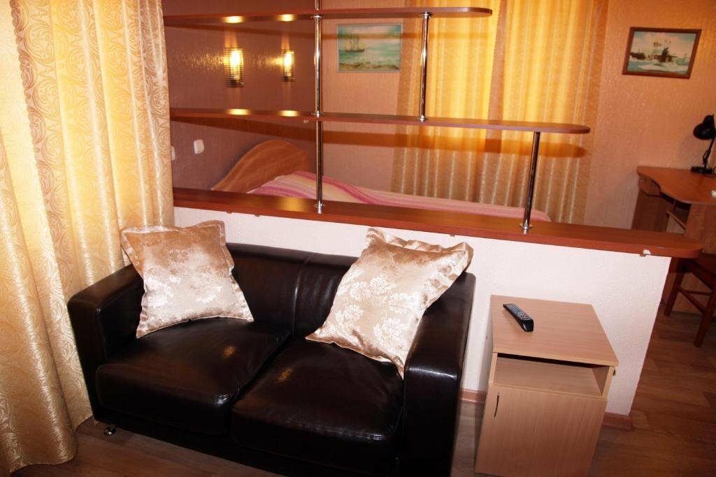Останавливались в номере полулюкс, очень понравилось. Номер просторный, есть всё для полноценного отдыха. Чайник, холодильник, микроволновая печь, полный набор посуды. Во время нашего посещения было отключение горячей воды, но наличие бойлера в номере решило эту проблему. Предлагались ззавтраки, по их цене 150 р на человека очень даже приличные: каша, омлет или запеканка, творог, сосиски, булочки местного хлебокомбината. Место тихое, но недалеко от центра, в общем остались довольны.