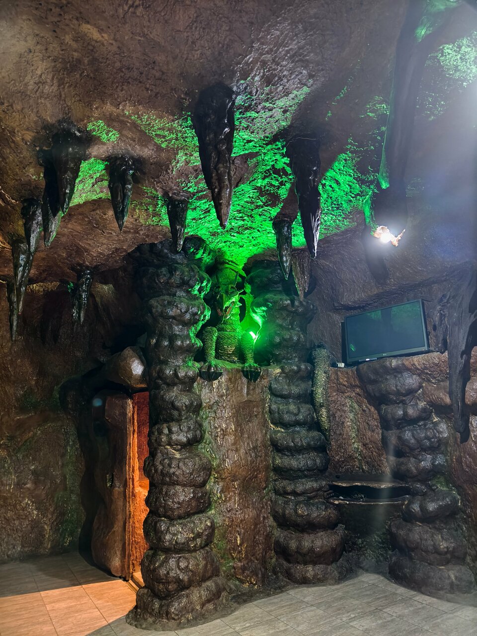 Понравилась баня! Очень антуражное оформление в виде пещеры. Хороший пар, хорошо прогревается, особенно если закрыть вытяжку чем нибудь!