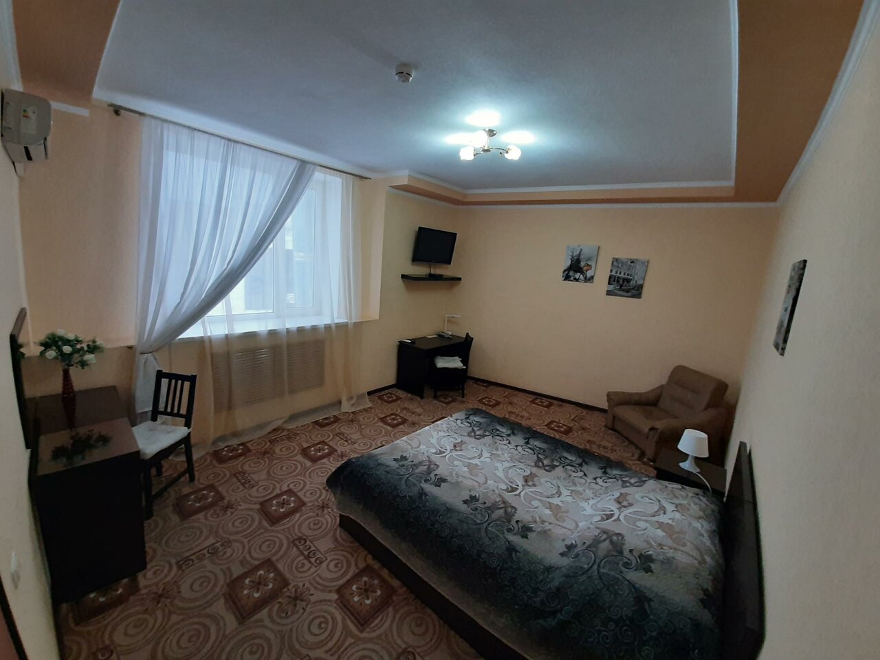 Конечно номер простой (ночлег) и требует ремонта. В отеле есть кафе, завтрак включен ( это не вкусно от слова совсем). Для тех кто хочет упасть в номер после поездки (не притяжательных) — норм.