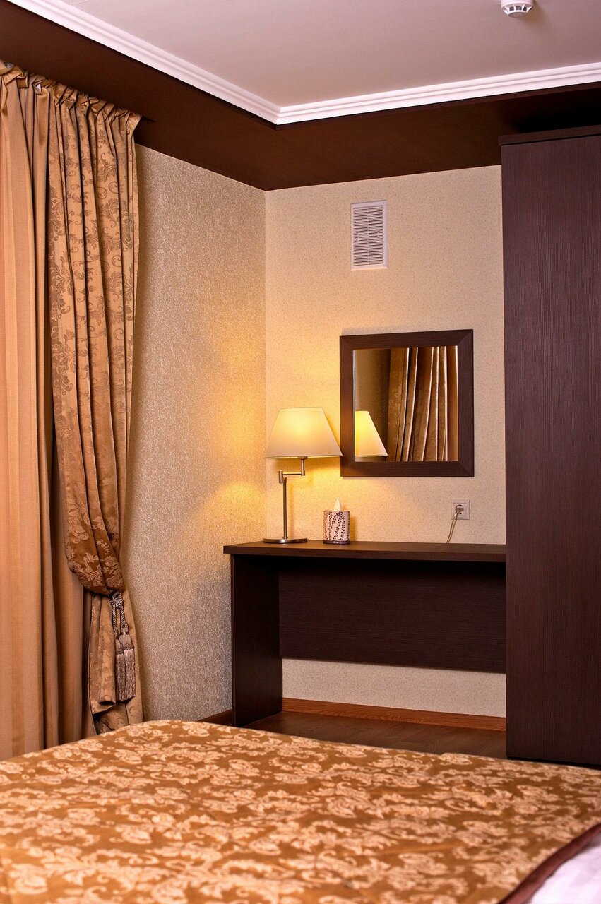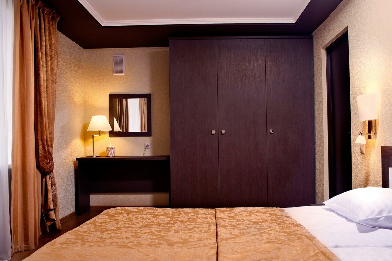 Стандартный двухместный номер площадью 23 м. кв. с привлекательным видом на город или тихий уютный дворик. В каждом номере: одна большая кровать, 2 прикроватные тумбы, индивидуальные ночные светильники, телевизор диагональю 43 дюйма, платя