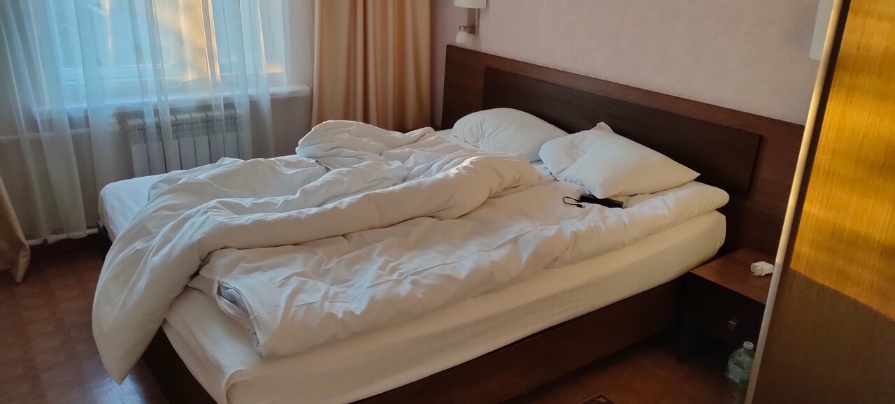 Огромный плюс кровати в номере очень огромная можно устроить хороший тройничок, а потом уснуть и никто не будет друг другу мешать))) хороший матрас и подушки, расположение входов лифта и номерации этажей вызывает вопросы често я терялся чем вызывал улыбку на ресепшене