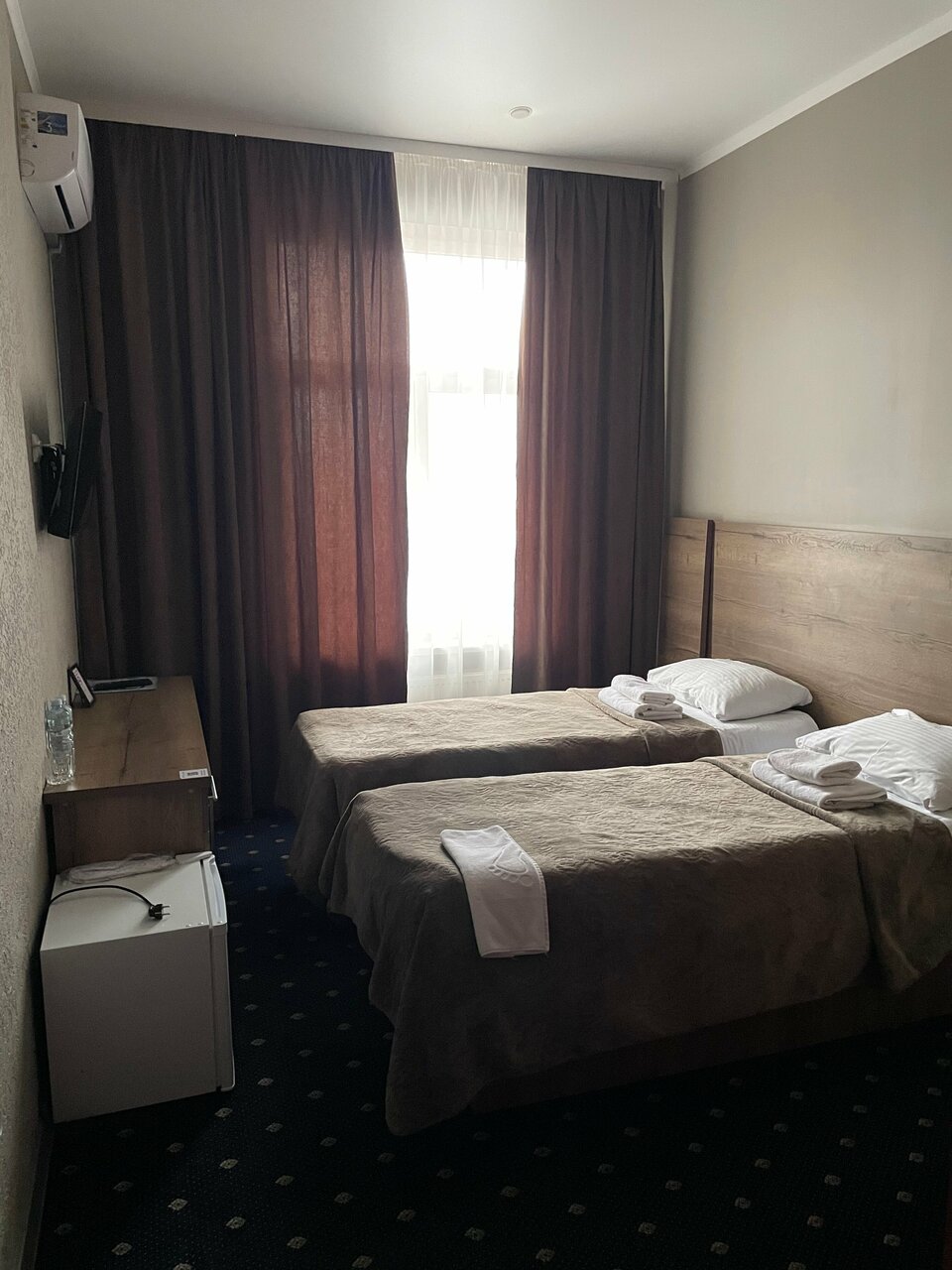 Очень маленький номер с двумя раздельными кроватями…ну очень маленький..одна розетка на весь номер и та внизу под телевизором…свет только потолочный или темнота..реально негде поставить даже один чемодан — приходится через него перешагивать…полное разочарование