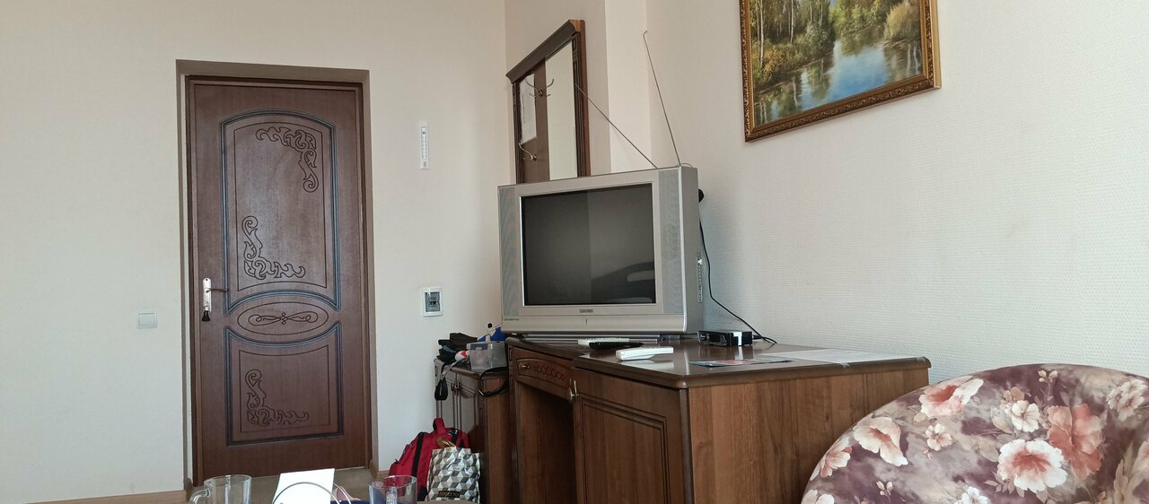 - Телевизор и диван в номере.