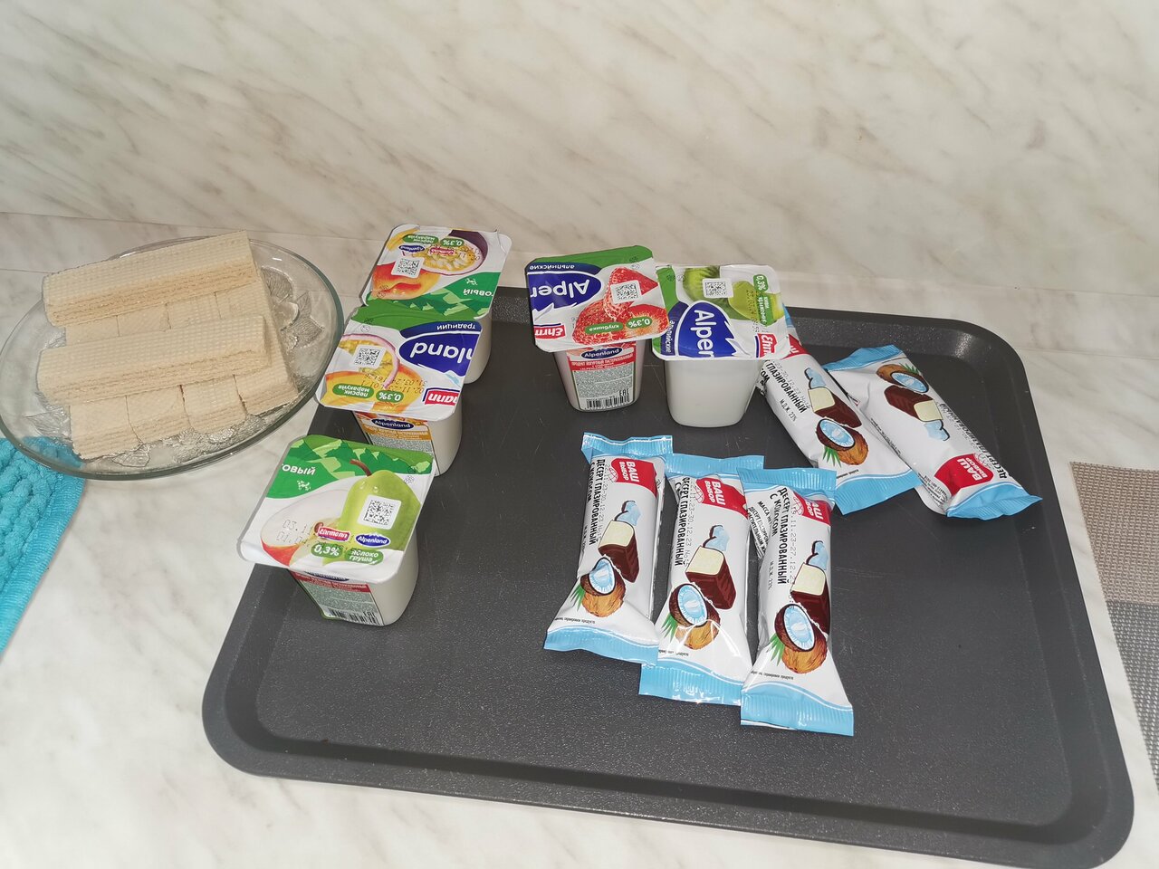 - Лёгкий завтрак (йогурт, творожные батончики).