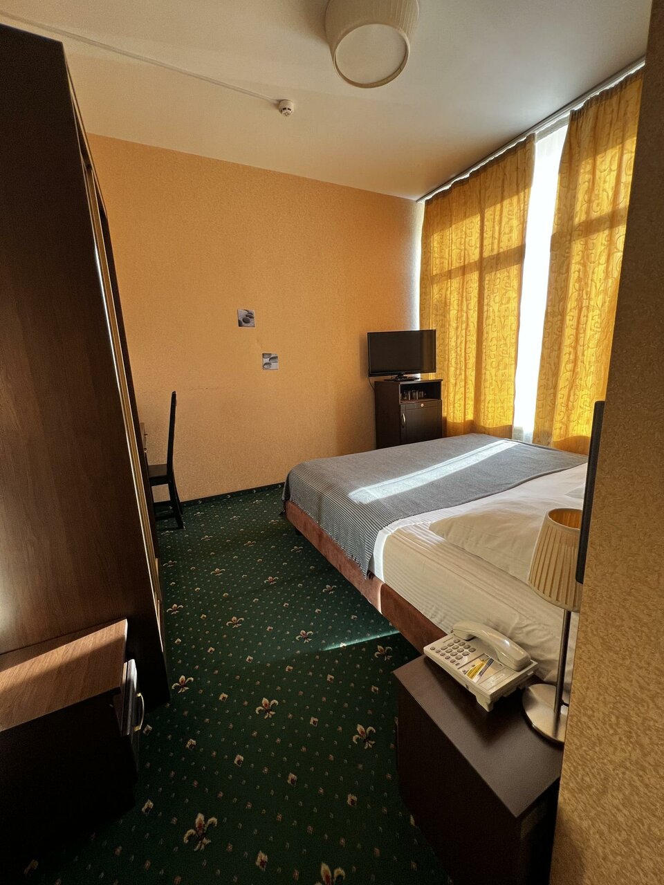 В номере жарко как в сауне. Номер прокуренный. Окно не работает на проветривание, только открывается на распашку. Грязный ковролин, следы от бычков на сиденье унитаза. Шум от трассы, которая проходит прям под окном. В общем выспаться не получилось.