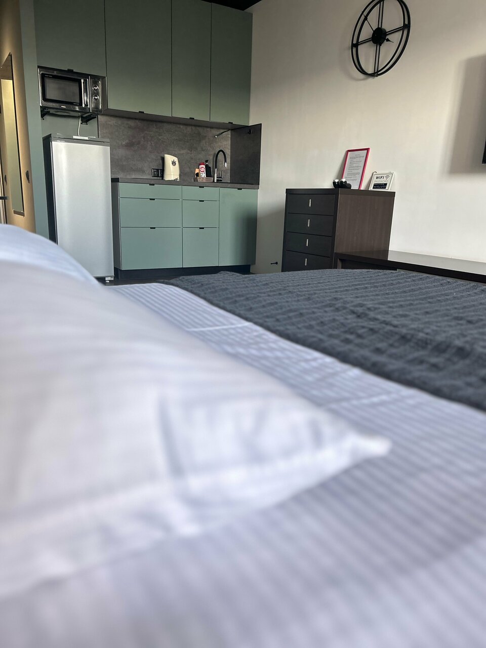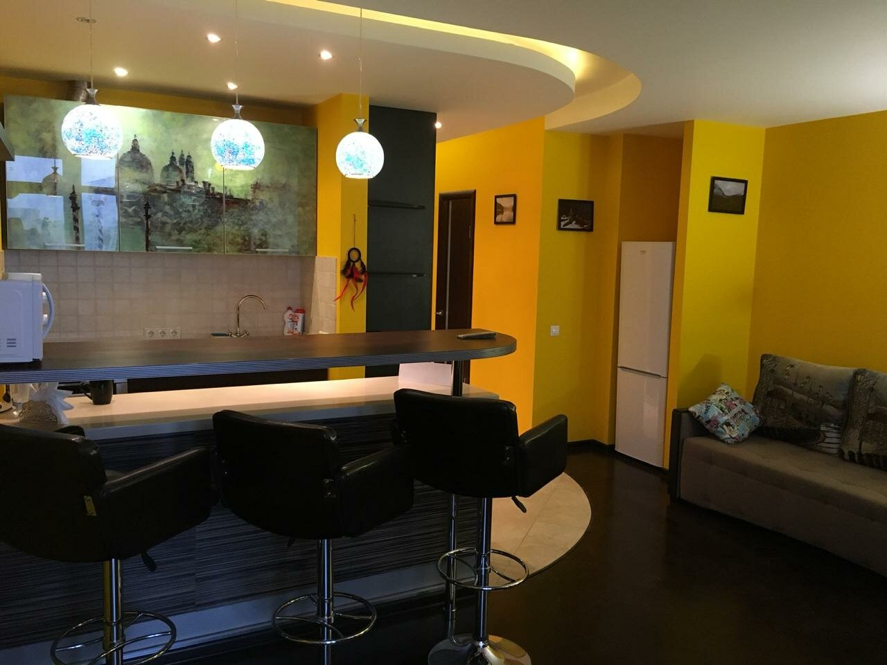 Приехал за день до важного совещания чтобы отдохнуть, а в итоге всю ночь не спал! Вместо кровати ДИВАН (мегажесткий, по ощущениям как на досках деревянных). Под окнами оживленная дорога, окна не открыть — шум и выхлопные газы. Зона готовки это вообще чудо, вытяжка в шкаф!!! Еду не ел, тк на вид отвратная. Перед гостем номер убран плохо. Картой не оплатите.