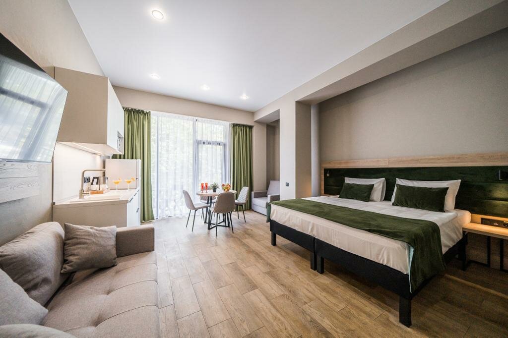 Арендовал аппартаменты. Номер соответствовал фото с сайта гостиницы Набор бытовой техникии — полный, вплоть до стиральной машины и варочной панели… В принципе есть все для автономного проживания, даже питания… Персонал доброжелательный и внимательный. В кафе (в здании) — скидка 20% Пляжные полотенца предоставляют, есть своя огороженная зона перед номером с 2-мя шезлонгами и столиком на 4 персоны