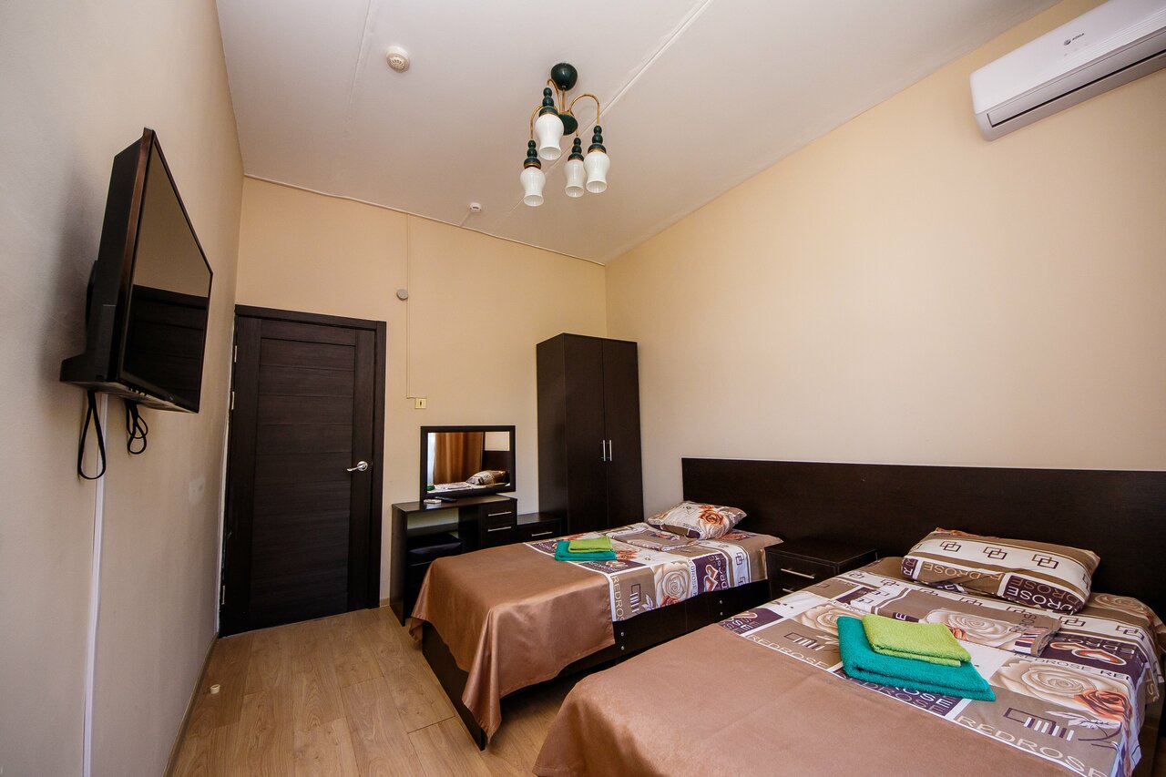 2х-местная кровать, одноместная кровать, шкаф, стол, стулья, 2 тумбы, зеркало, кондиционер, телевизор, холодильник, чайник, посуда, сушилка для белья, интернет Wi-fi.Санузел в номере (горячая и холодная вода круглосуточно).