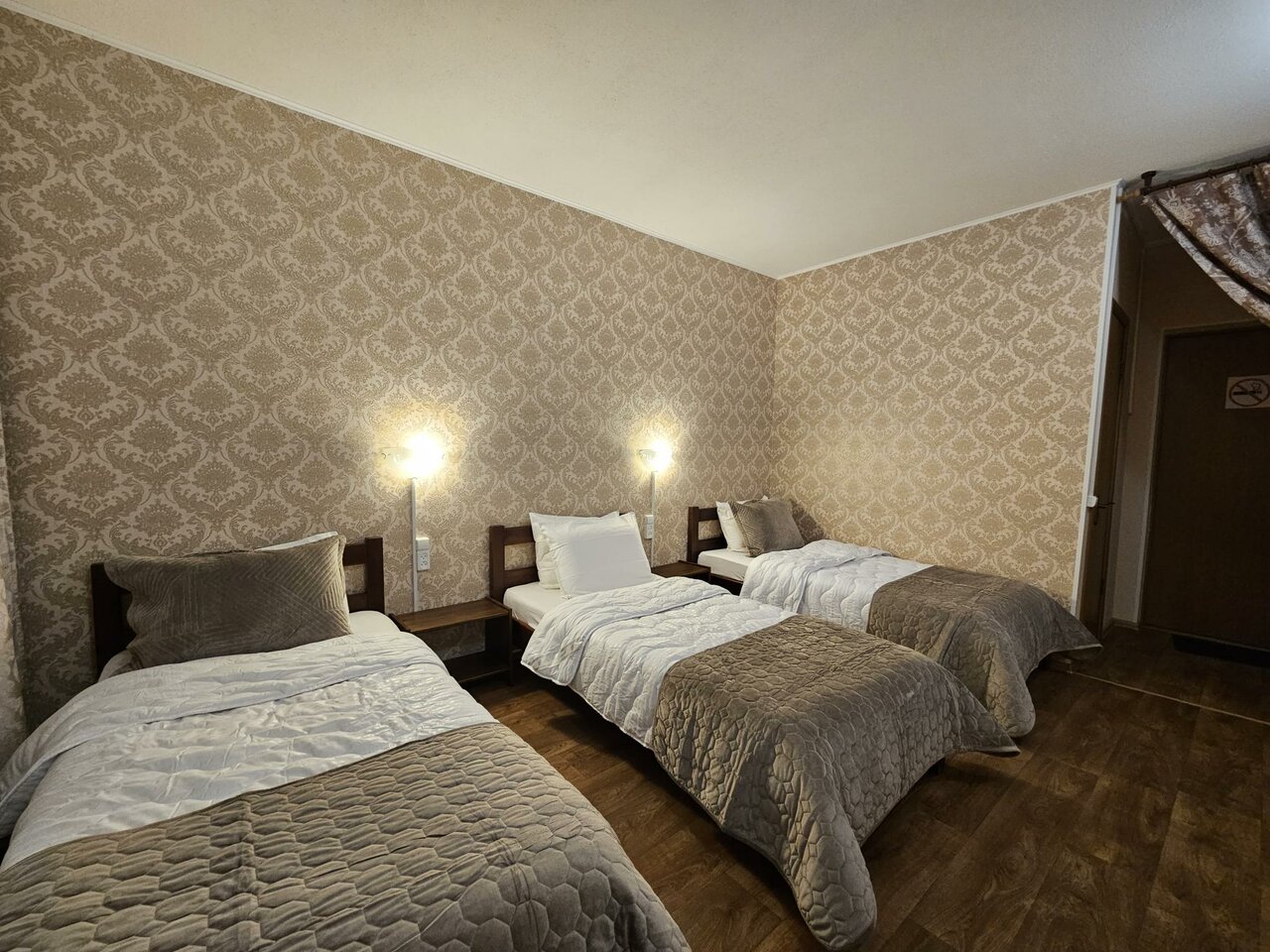 Площадь номера 20 кв.м.Три односпальные или одна большая кровати и одна односпальнаяСтол и стульяНабор для приготовления чайЖК телевизор со SMART TVWi-Fi бесплатноБелоснежное постельное белье и полотенца