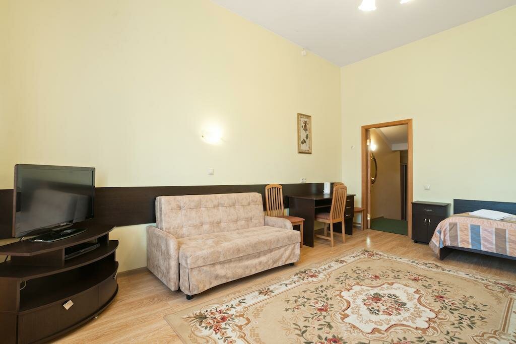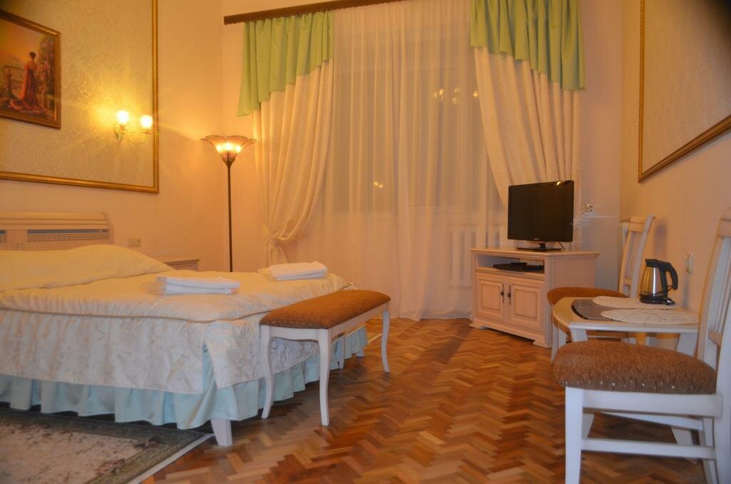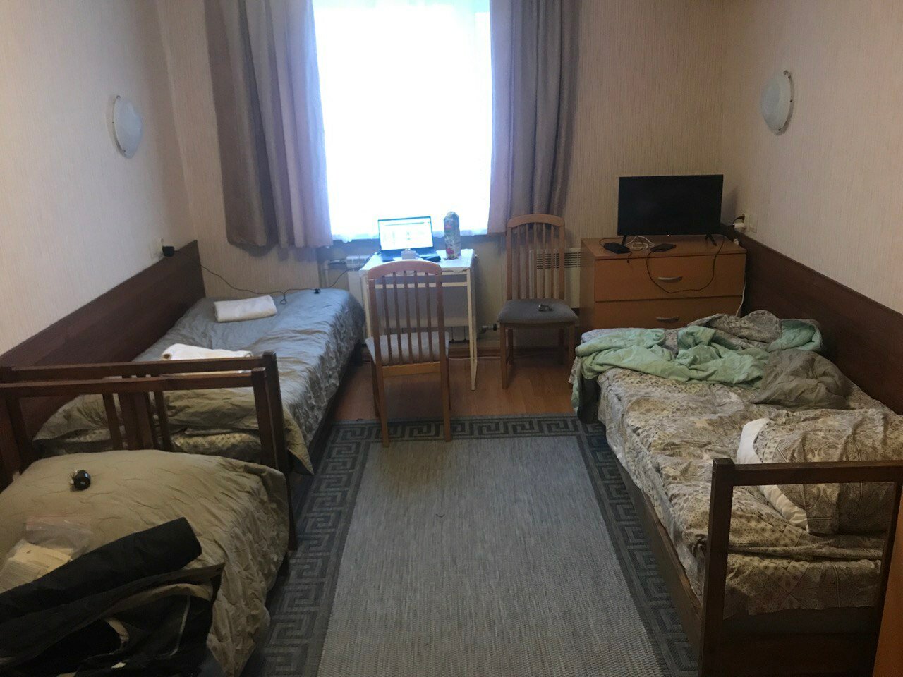 Само состояние гостиницы напоминает о советских временах. Было ощущение, что перенеслись назад в прошлое. Но при этом сам номер (номер делюкс) при своей цене оказался более чем достойным. Внушительных размеров, с предбанником. Огромная и удобная кровать, стерильная чистота в номере. Окна выходили в тихий двор, спать никто не мешал. На общей кухне можно было воспользоваться всеми столовыми принадлежностями. Завтрак был очень сытным, принесли его себе прямо в номер. Не всегда удобна была необходимость сдавать ключи администратору при выходе из гостиницы. Также как и ограничение входа по времени.