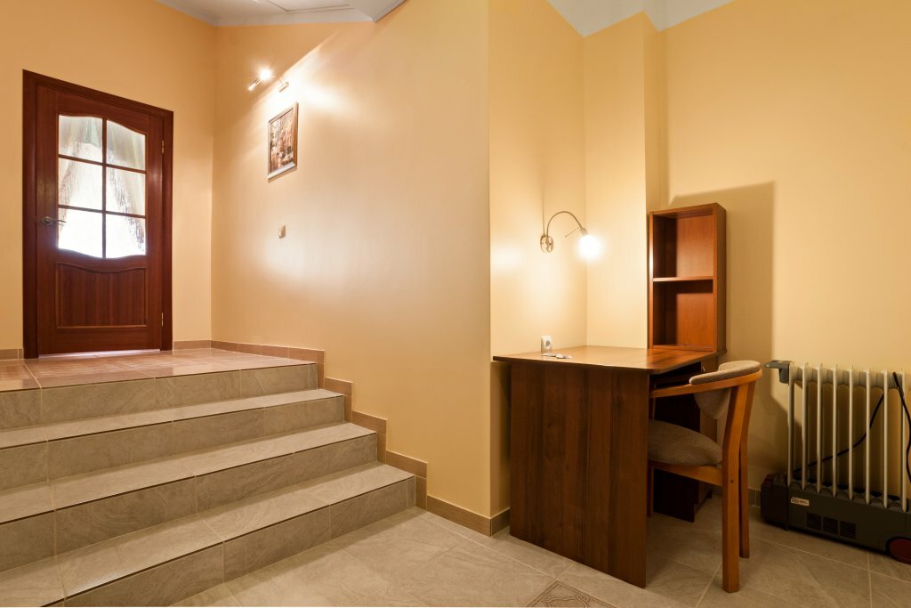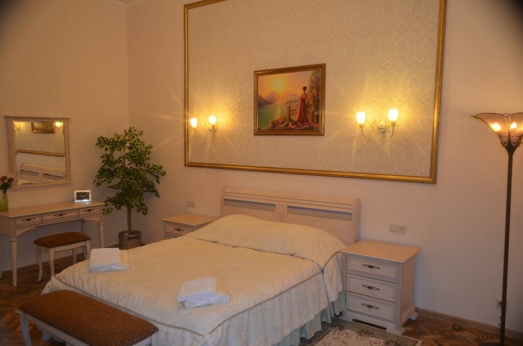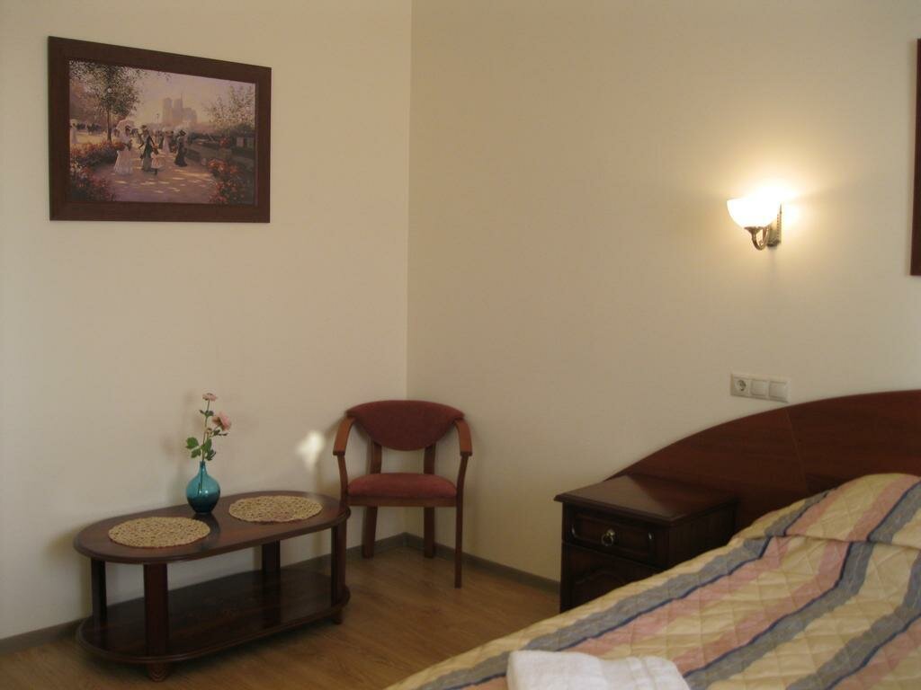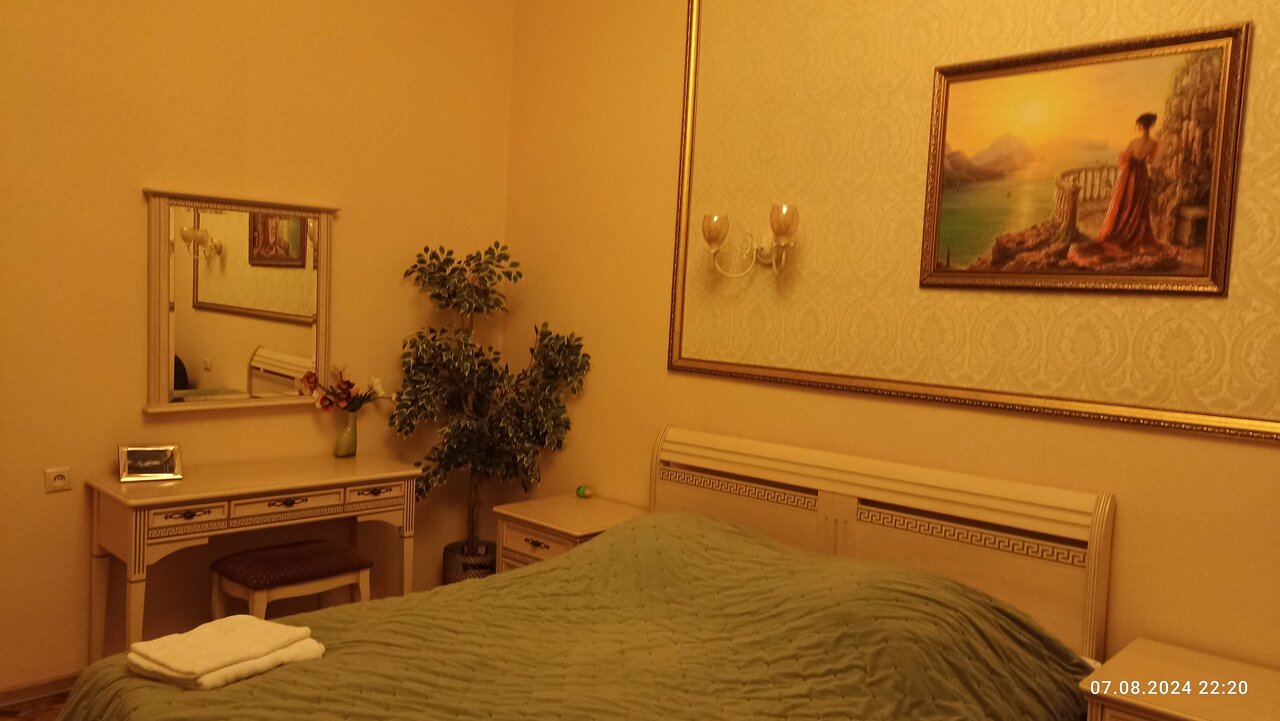 Хорошая гостиница. Нам достался огромный номер с двухместной кроватью. Много мебели: стулья, диван, кресло, тумбы, комод, шкафы и даже сервант ( или что то типа его ). Свой санузел, огромная прихожая. Есть большой полноразмерный холодильник, ТВ. Все чистенько. Гостиница еще с Советских времен, в жилом доме, на втором этаже. Кондиционера нет. На окнах сетки. Много розеток. Окна нашего номера выходили во двор — шумно, как с утра так и вечером. Стоянка перед входом есть, камера у администратора просматривает 2-3 места. Но можно припарковать авто во дворе, под собственным взором из номера. Гостиница понравилась, рекомендую. Сняли на две ночи, посещали Орешек.